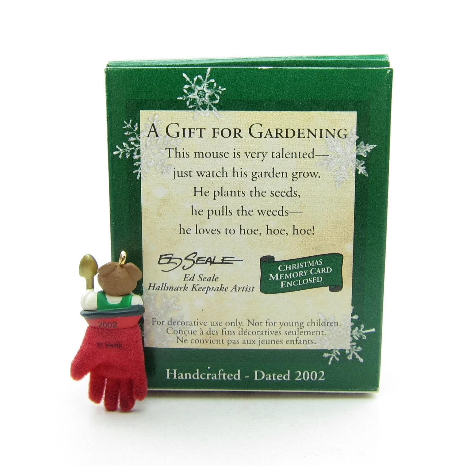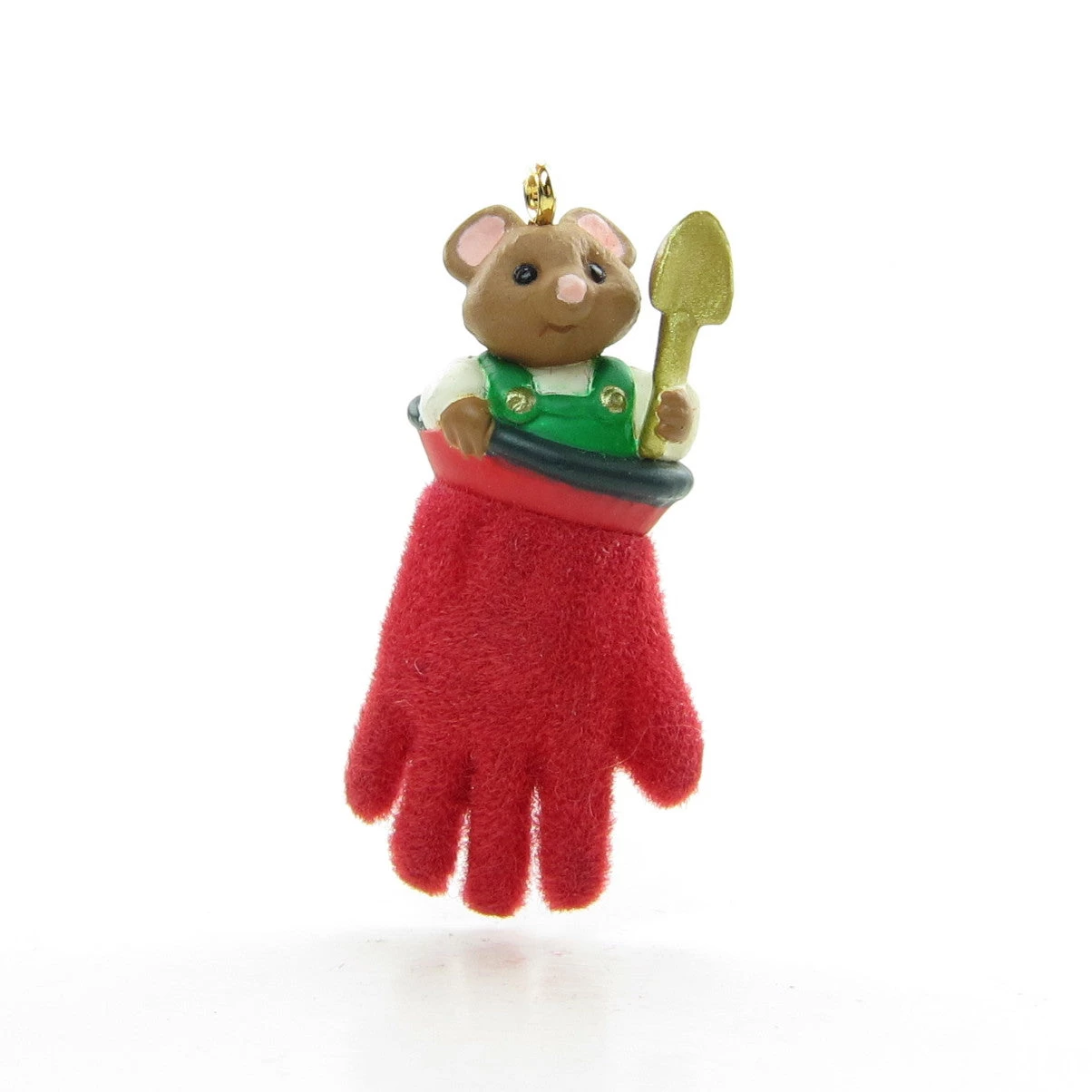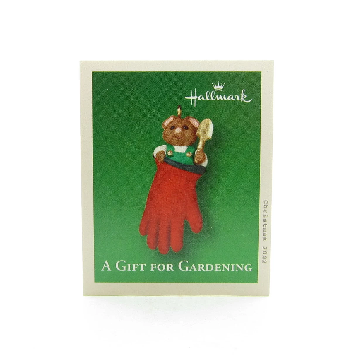 This miniature Hallmark Keepsake Ornament from 2002 says “A Gift for Gardening” on the front of the box and has a tiny mouse in green overalls sticking out of a red flocked garden glove. The cheery mouse is holding a gold spade in one hand. The ornament comes with its original box and a Christmas memory card.