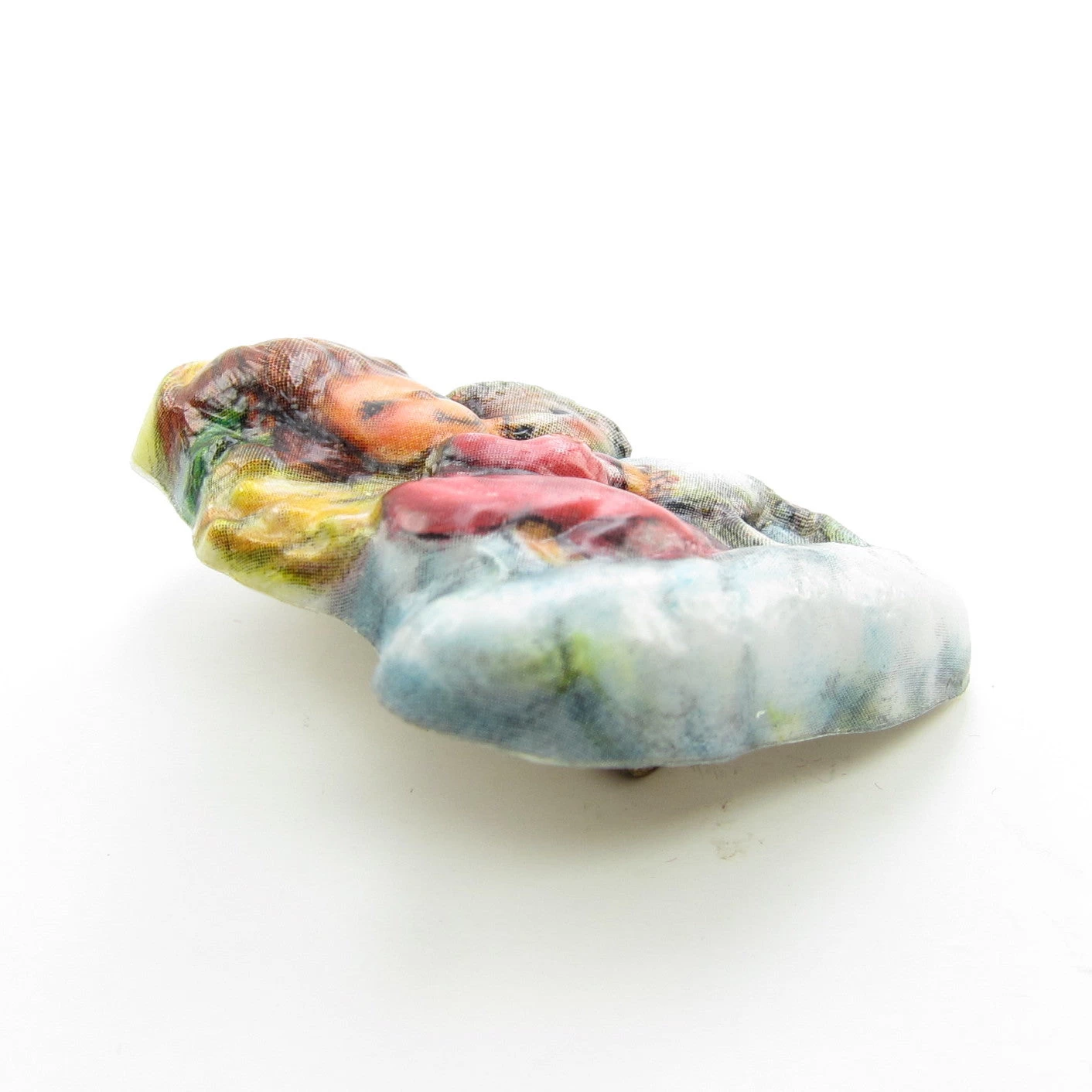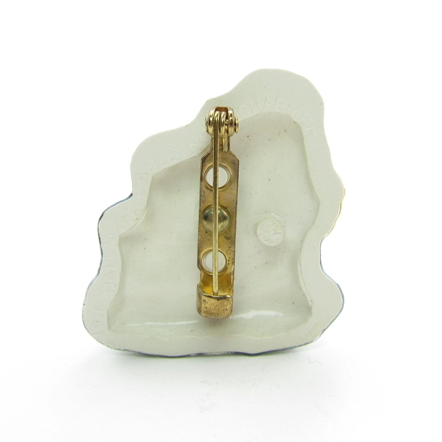 The pin is made of plastic and has a contoured, 3D shape. The painted-on image looks like a decoupage design rather than just painted sections of plastic like other Hallmark pins and is a design by artist Mary Hamilton.