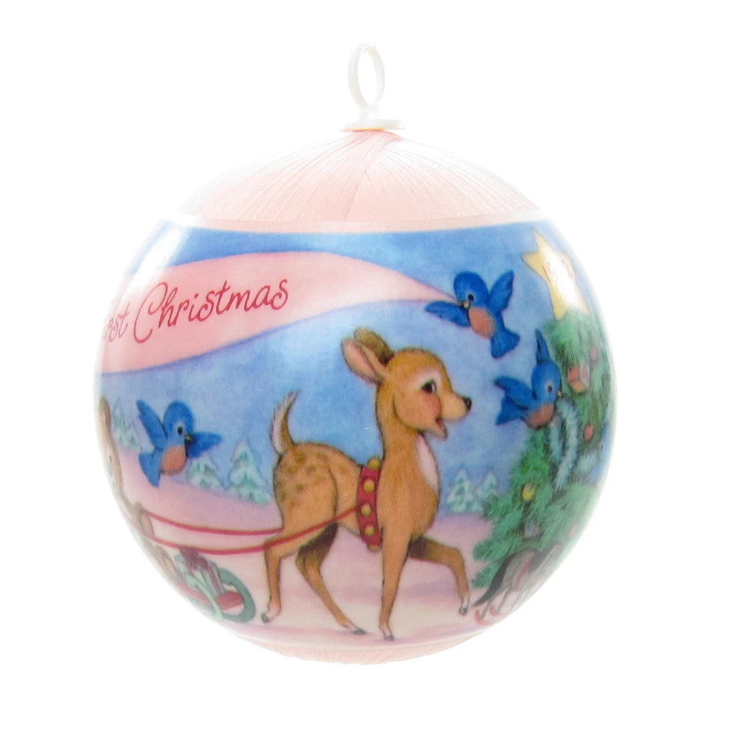 This “Baby’s First Christmas” Hallmark Keepsake Ornament is from 1992 and features a pink silk ball with a cheerful Christmas scene to celebrate a baby girl’s first Christmas.