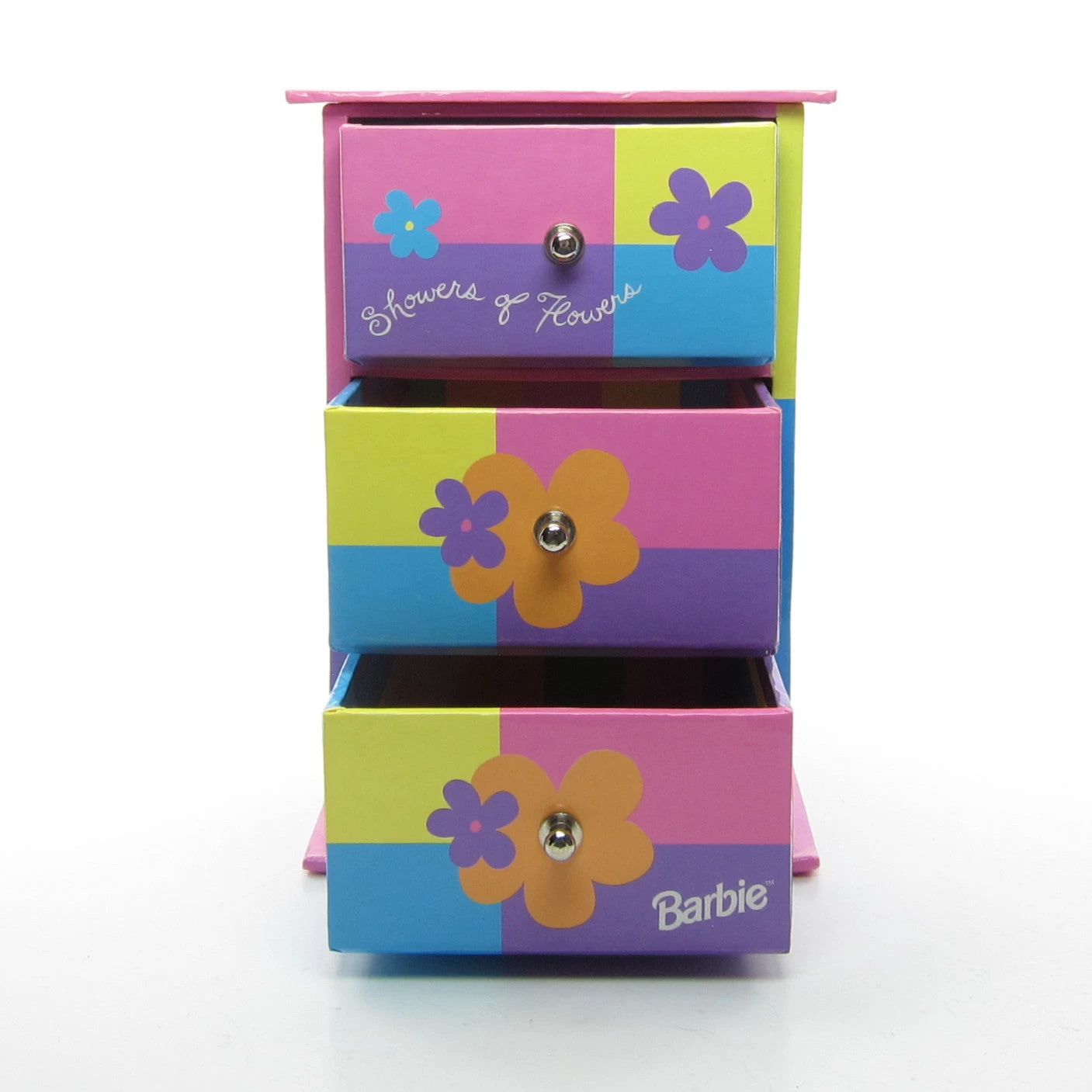 This vintage Barbie chest of drawers or jewelry box has three drawers and a colorful pattern that says “Showers of Flowers.” The box is made of sturdy cardboard coated with glossy paper. The drawers have small silver knobs on the front and are perfect for storing jewelry, Barbie doll clothes and accessories, desk supplies, and other small items.
