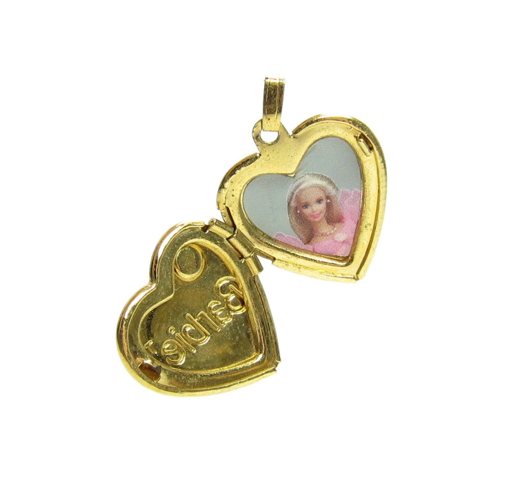 The locket opens up and has a picture on one side of a Barbie doll wearing a pink dress with poufy sleeves.