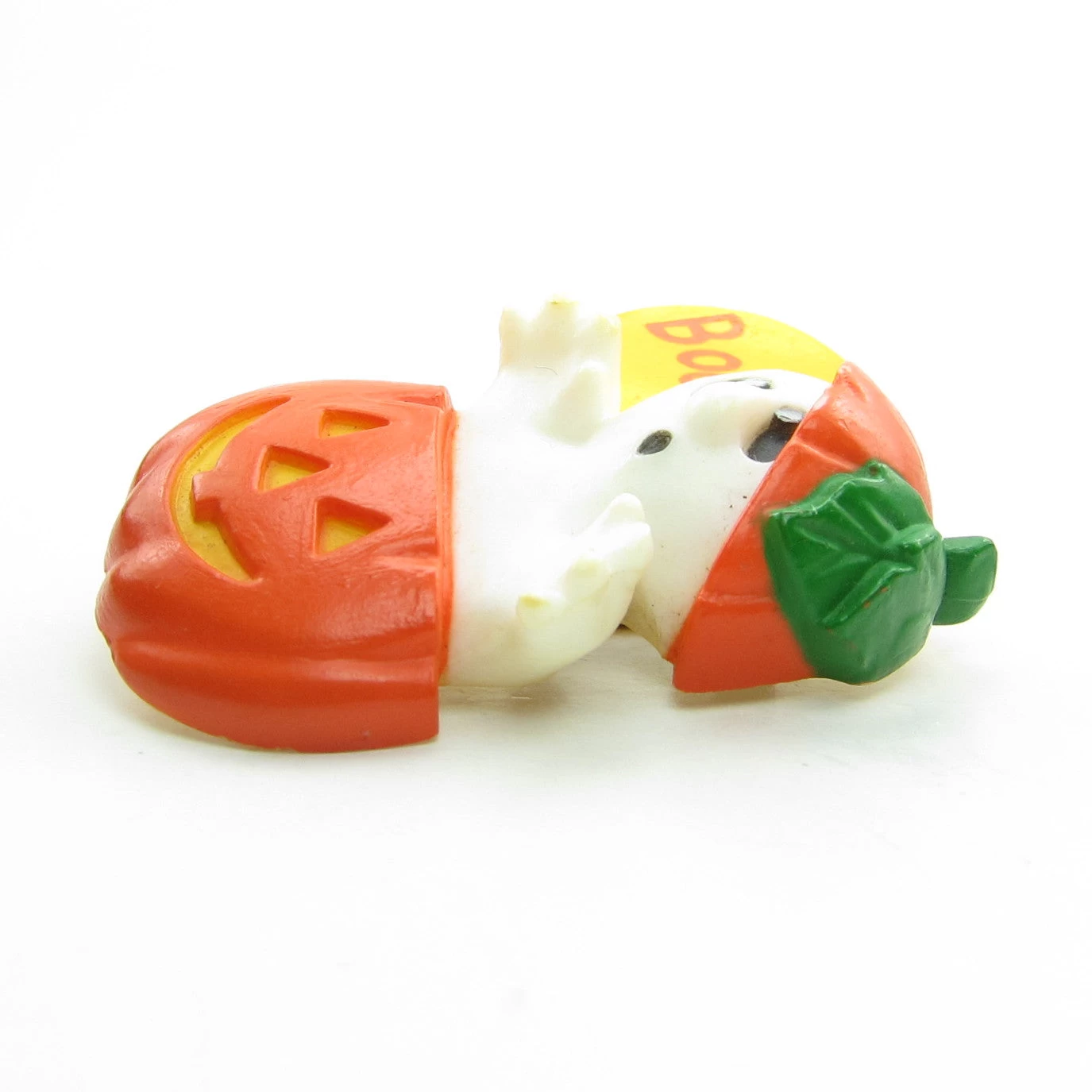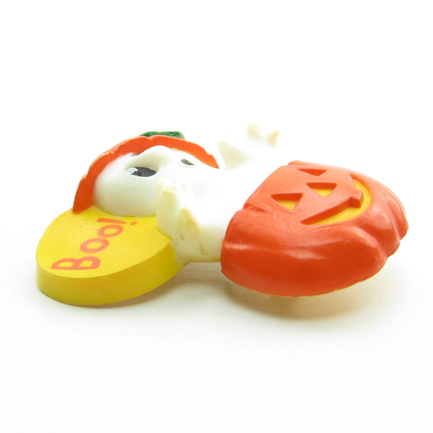 This vintage Hallmark pin features a white ghost rising up out of a jack-o’-lantern. He’s wearing the top of the pumpkin on his head like a hat and there’s a yellow circle behind him that says “Boo!” in orange letters.