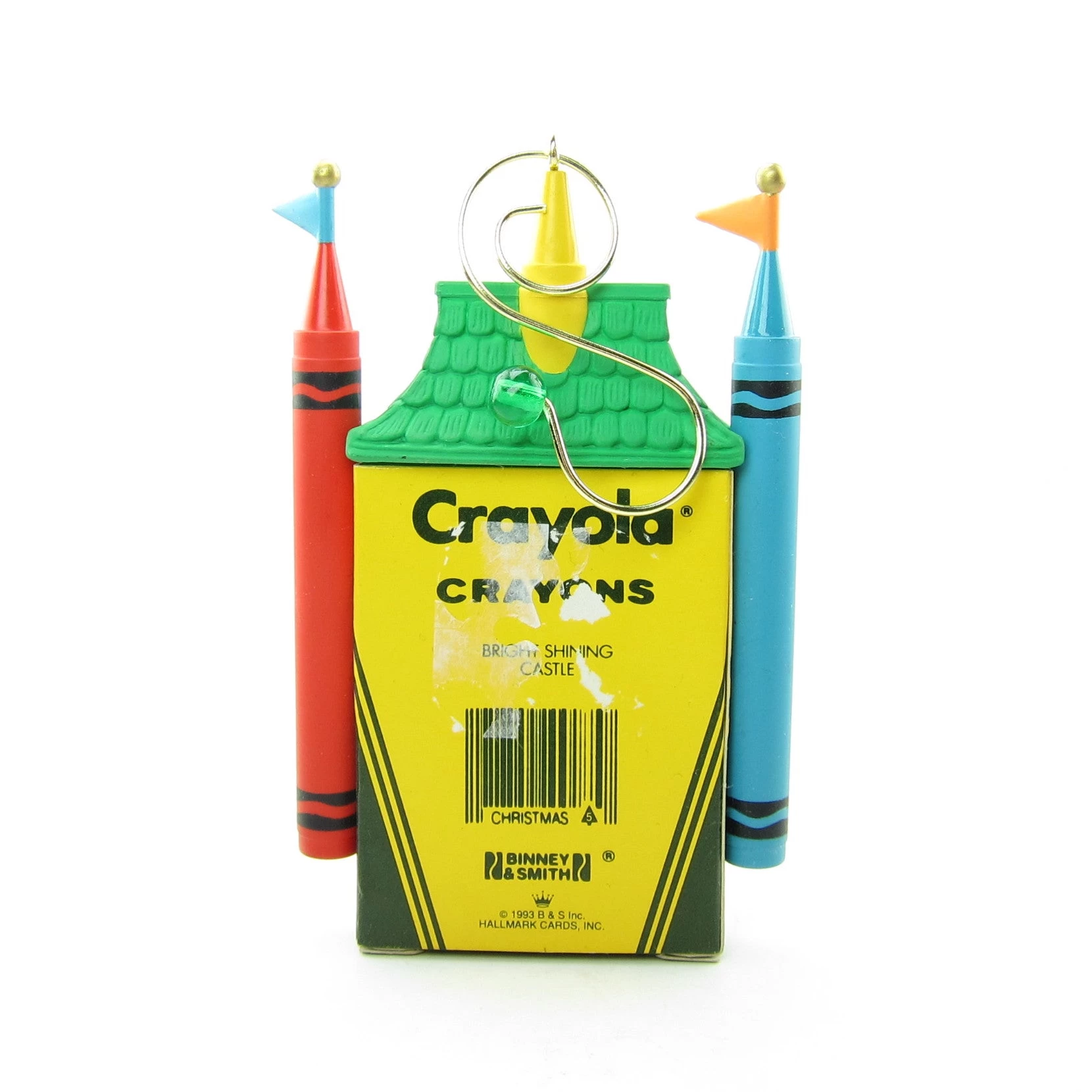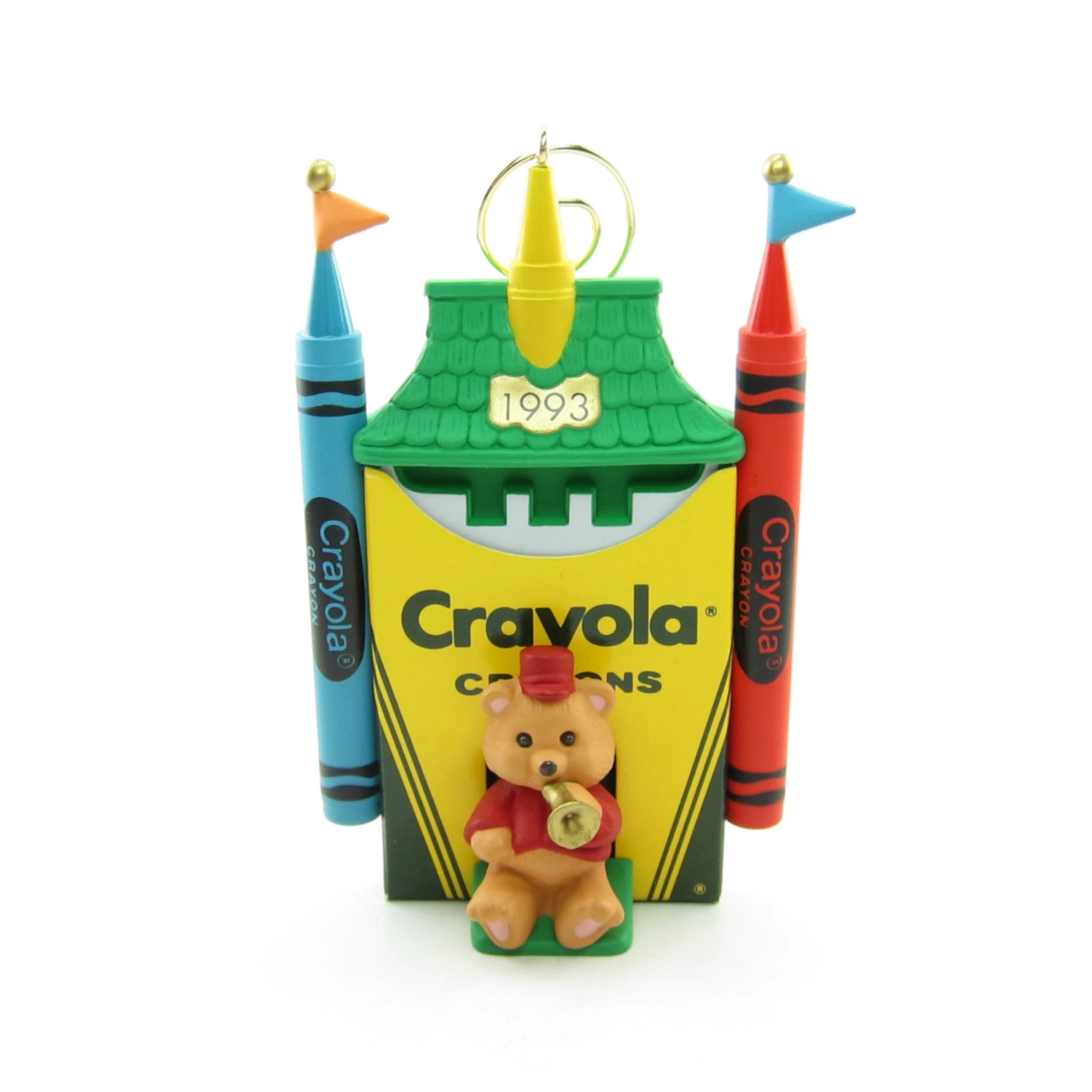 The ornament looks like a castle made from a Crayola Crayons package. The package is made of real cardboard and there are blue, yellow, and red crayons. The roof is green and has a gold sign on it that says 1993. A bear sits in front of the castle blowing a gold horn and there’s a spiral ornament hanger with a green bead attached to the top.