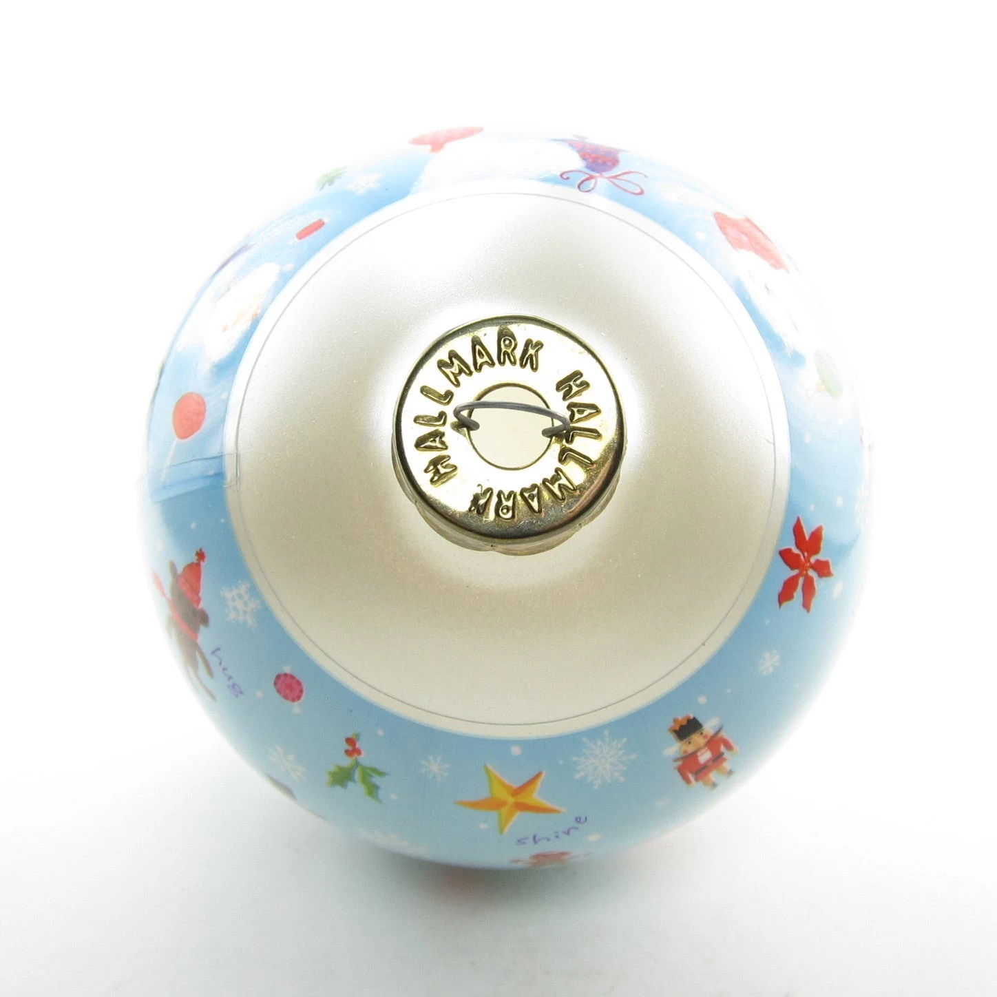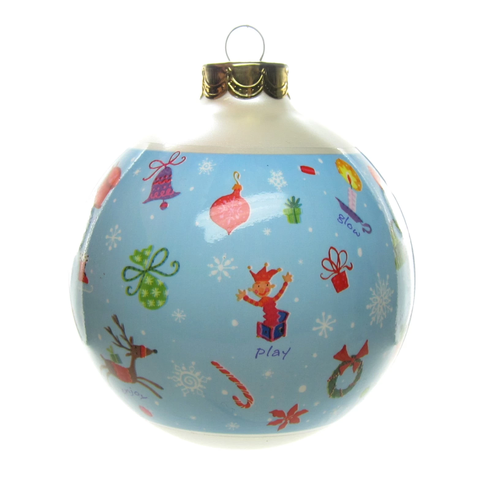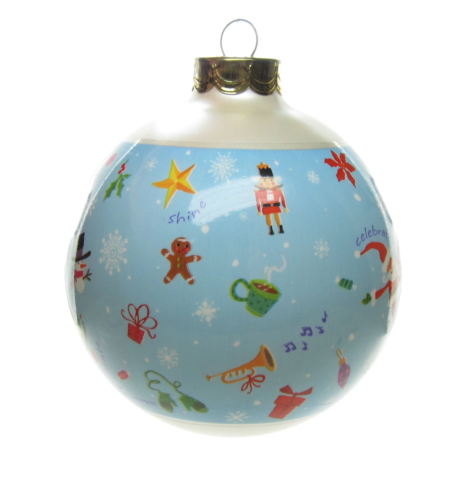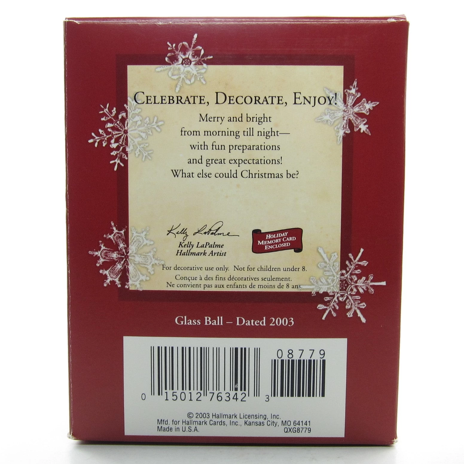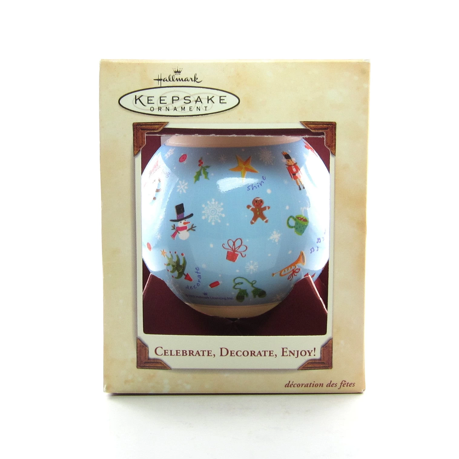 This Hallmark Keepsake Ornament from 2003 is called “Celebrate, Decorate, Enjoy!” It’s a glass ball with a shimmery, pearlescent finish and has festive, whimsical designs and words on a blue background with white snowflakes.Â