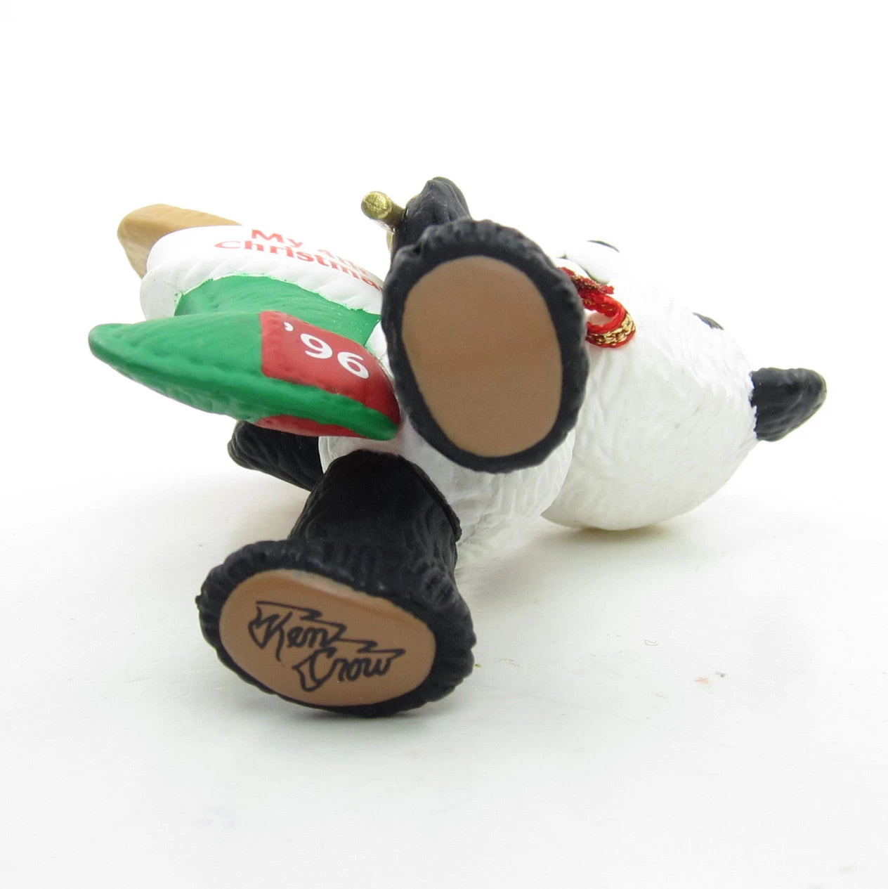 This vintage Hallmark Keepsake Ornament from 1996 is “Child’s Fourth Christmas” from the Child’s Age Collection. The ornament features a cute little panda bear holding a green Christmas stocking that says “My 4th Christmas” and is dated ’96. There’s a cookie in the stocking that’s decorated like a drum and has the number 4 on it.