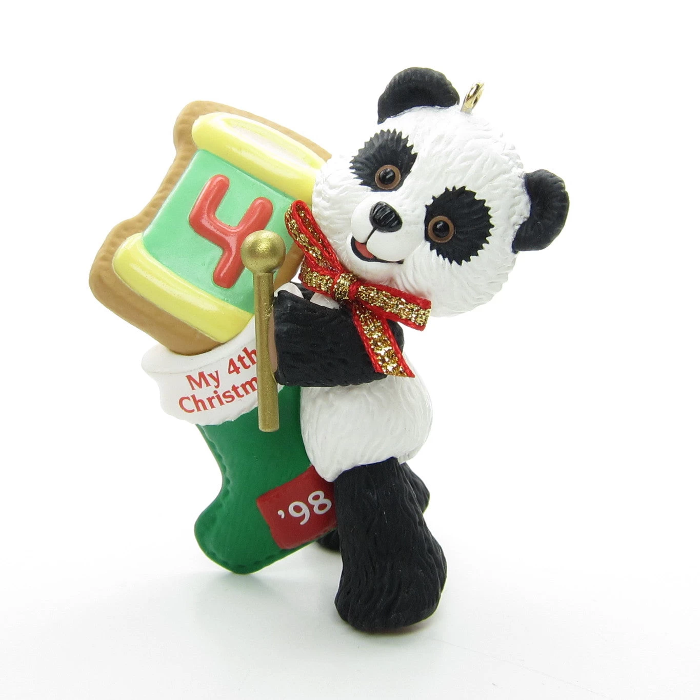 This vintage Hallmark Keepsake Ornament from 1998 is “Child’s Fourth Christmas” from the Child’s Age Collection. The ornament features a cute little panda bear holding a green Christmas stocking that says “My 4th Christmas” and is dated ’98. There’s a cookie in the stocking that’s decorated like a drum and has the number 4 on it.
