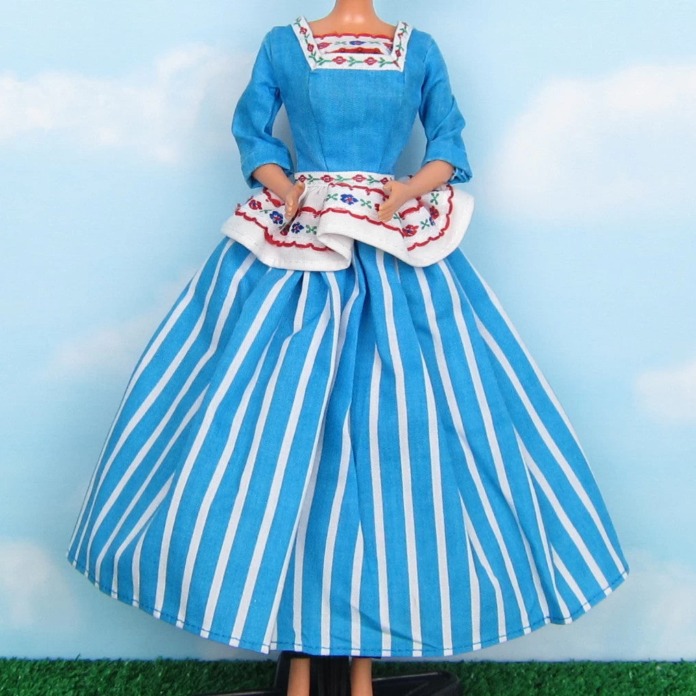This vintage Barbie doll dress is for the Dolls of the World Dutch Barbie doll #11104 from 1993. The dress is a traditional folk costume from the Netherlands and has a turquoise blue bodice and a full blue and white striped skirt. There’s white trim with red and blue flowers at the neckline and on a ruffle at the waist.