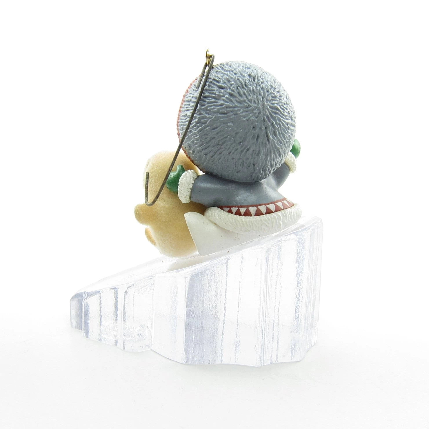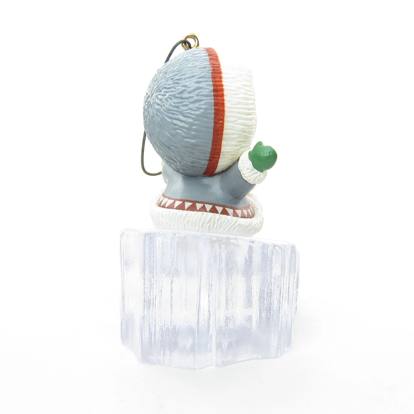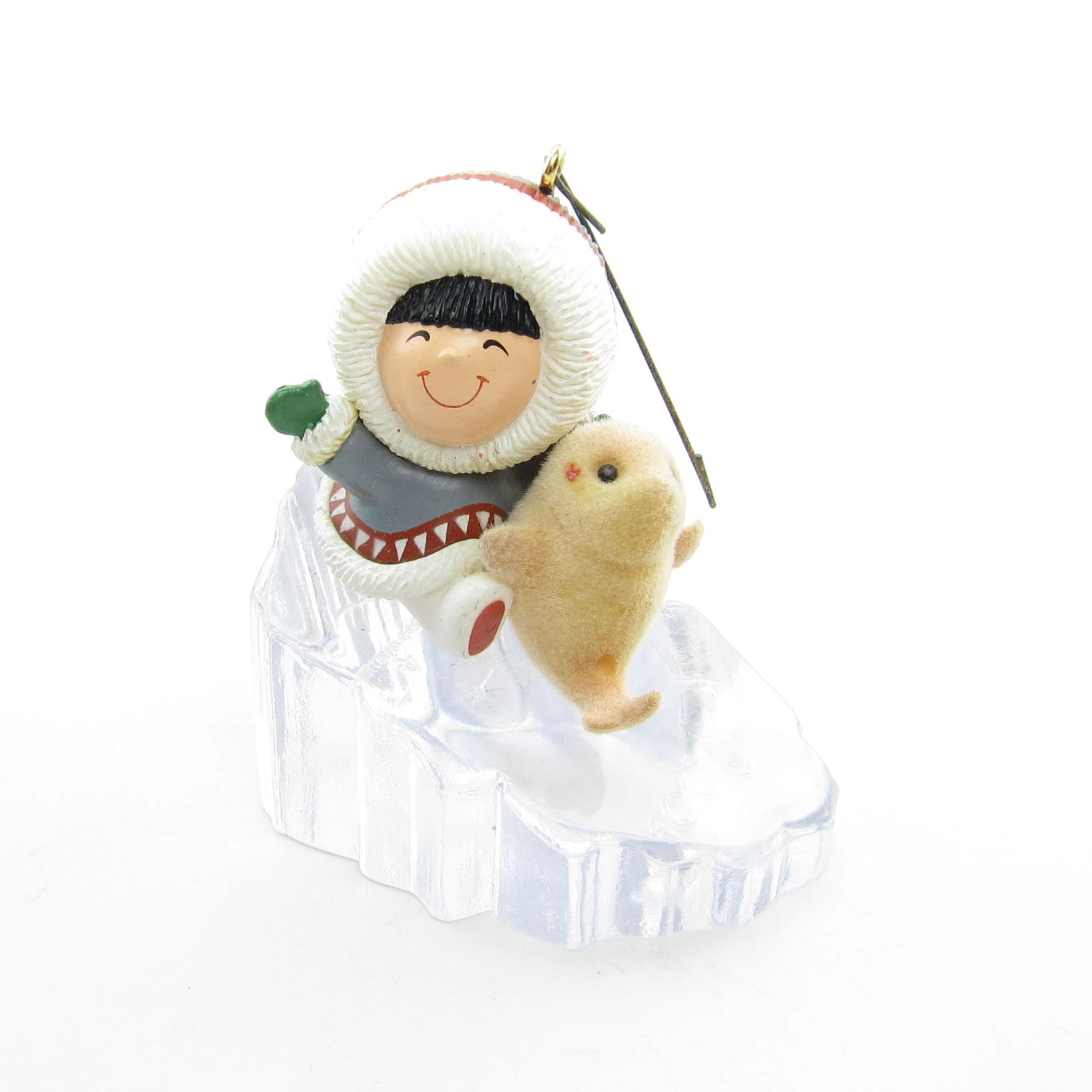 This vintage Hallmark Keepsake Ornament from 1990 is #11 in the Frosty Friends Collector’s Series. The ornament features a sweet child sitting on an iceberg with a flocked seal. There’s a hook at the top for hanging.