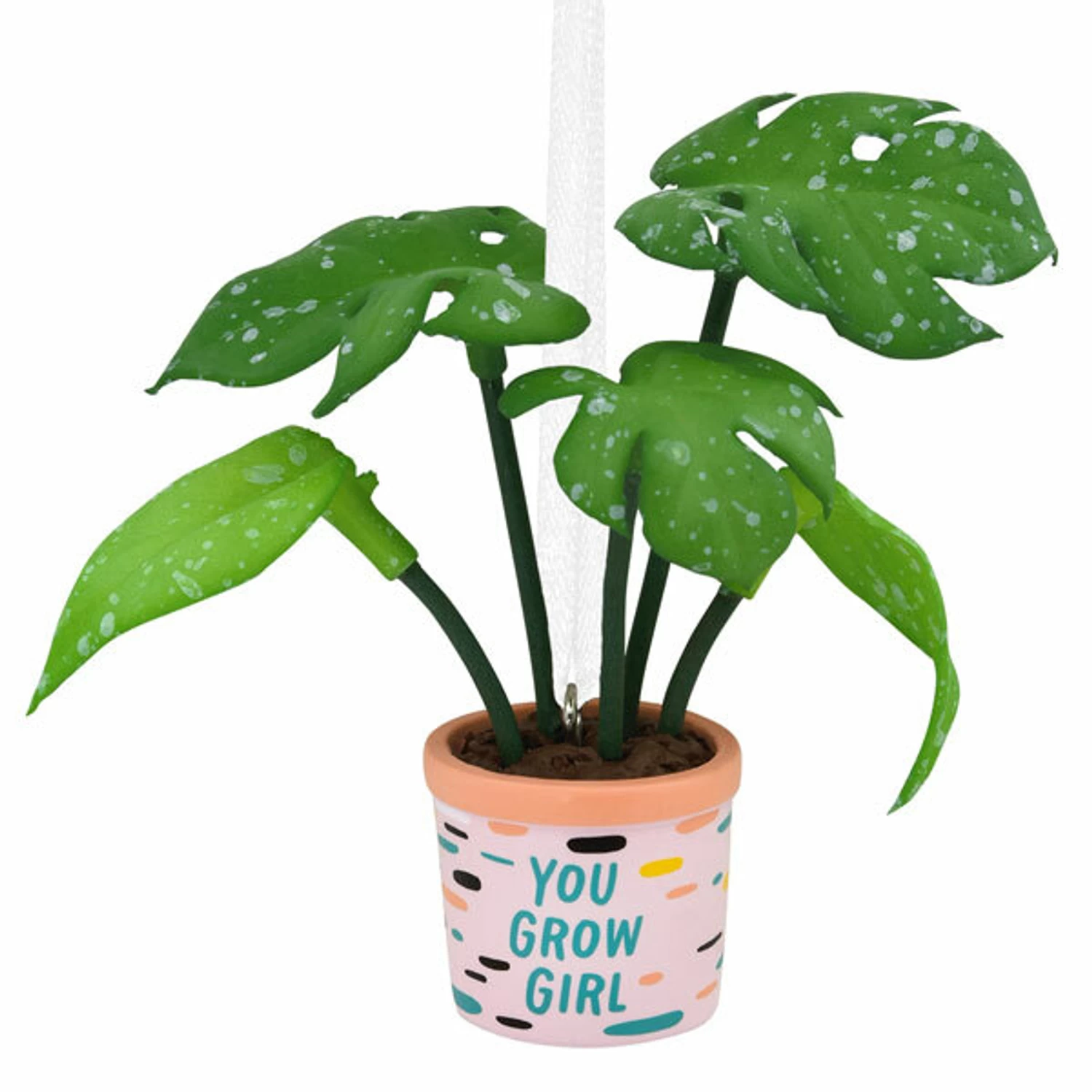 Plant ladies and dudes UNITE! This ornament features a colorful pot that reads “You Grow Girl!” on the front with a large variegated monstera snuggled planted in the pot! Perfect for any plant lover on your Christmas list! Made by Hallmark. Made of resin and polyester. Dimensions: 1.8″ x 3″ x 3″. Item #: 1HGO2809