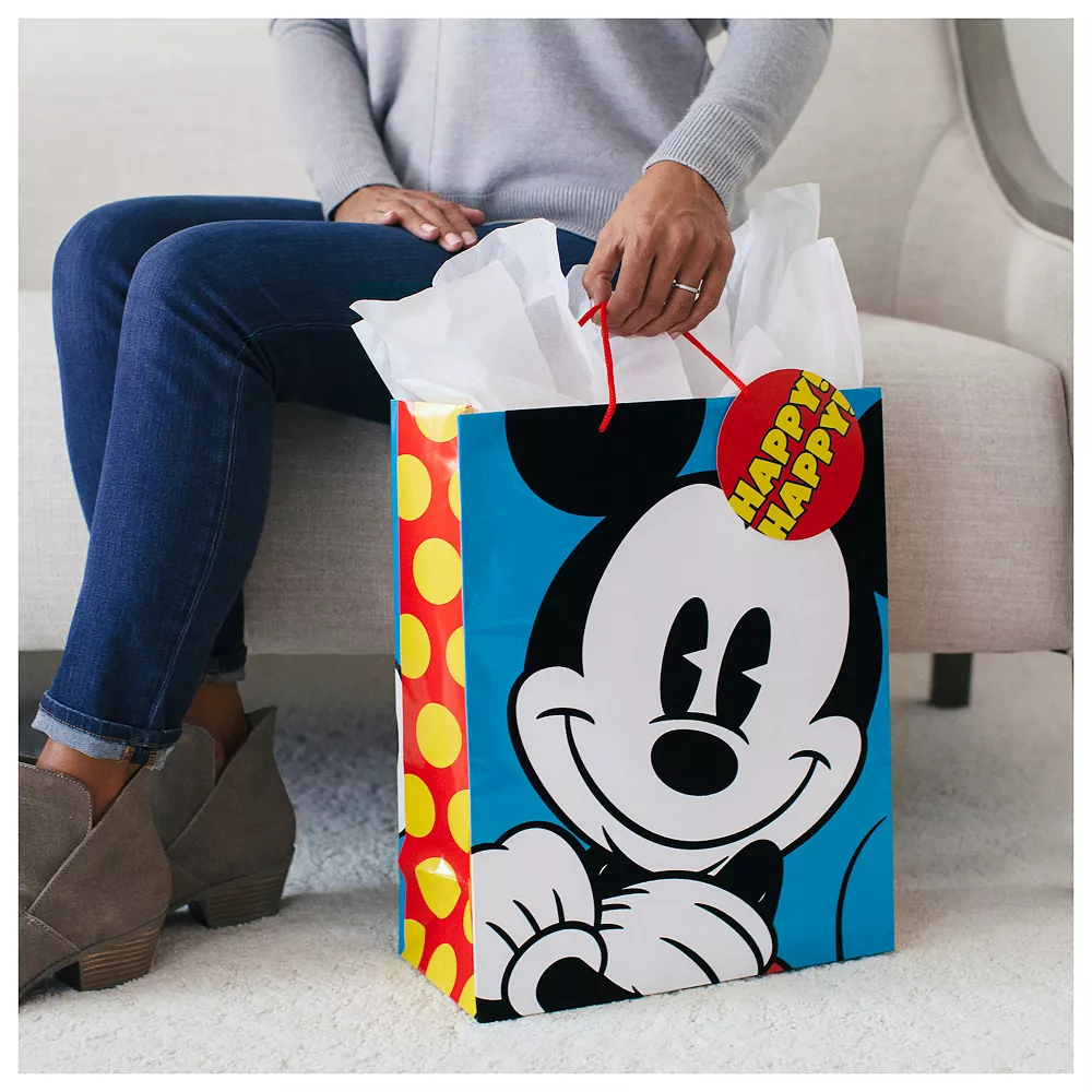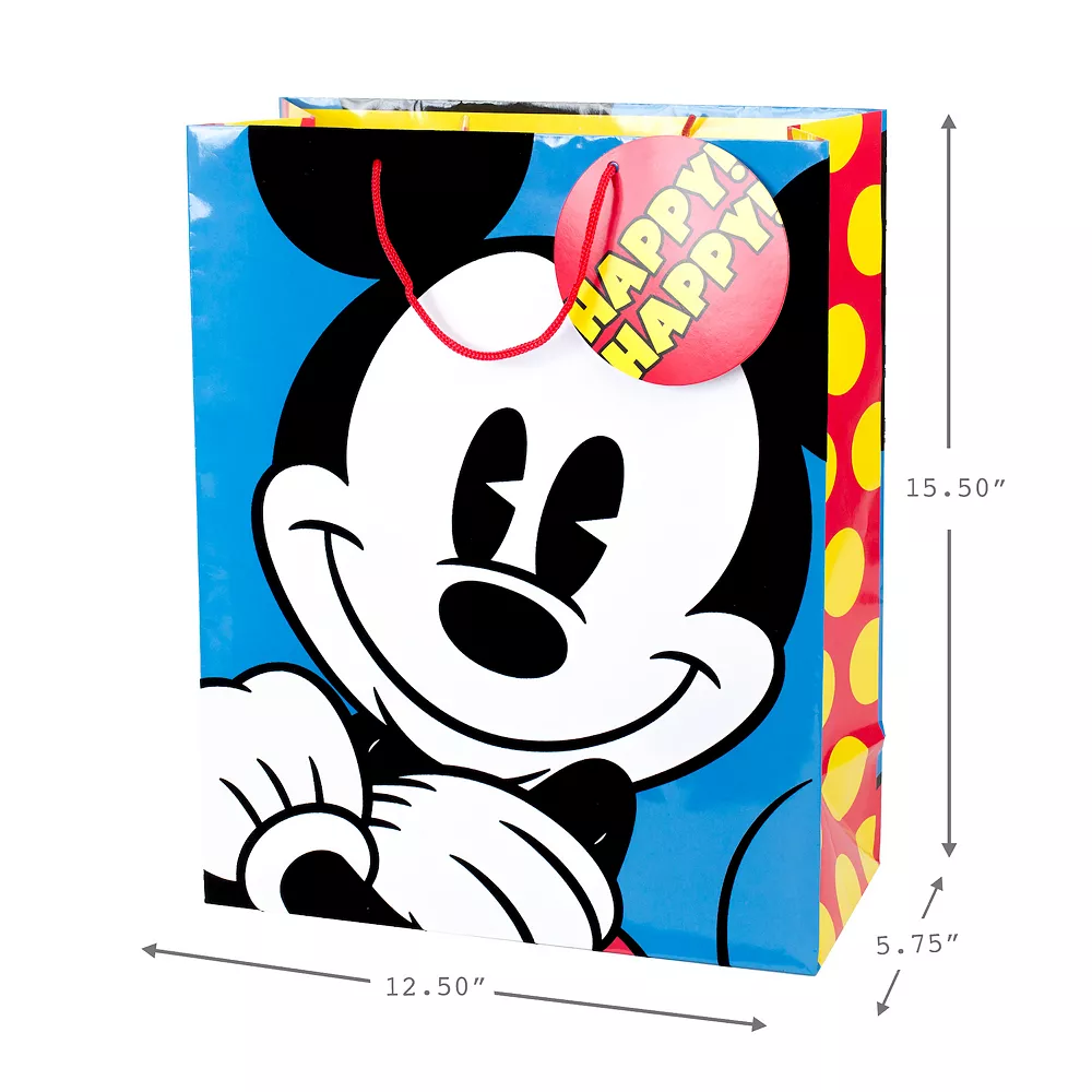This bright and bold gift bag prominently features a textured Mickey Mouse smiling broadly on a blue background. It’s the perfect gift bag for a Disney fan.