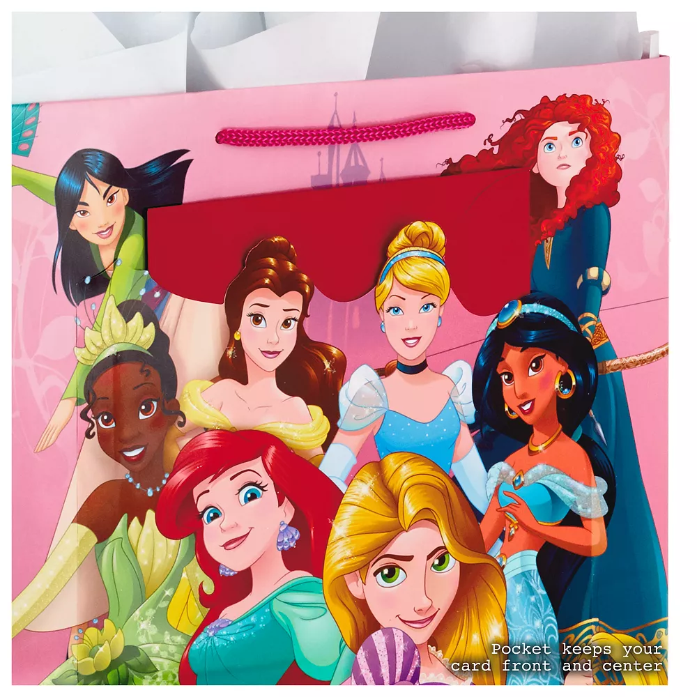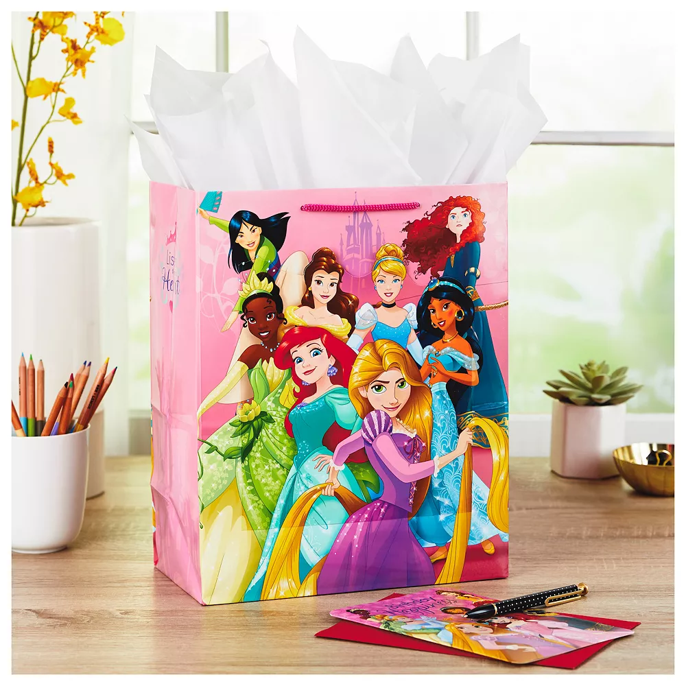 Featuring a festive, foil-accented design, this large gift bag with tissue paper and a birthday card is a perfect way to wish your favorite Disney princess fan a happy birthday. All-in-one gift bag, tissue paper, and card set makes presenting birthday gifts quick and easy, and this package is sure to make the right impression as you celebrate another year of your friend or family member.