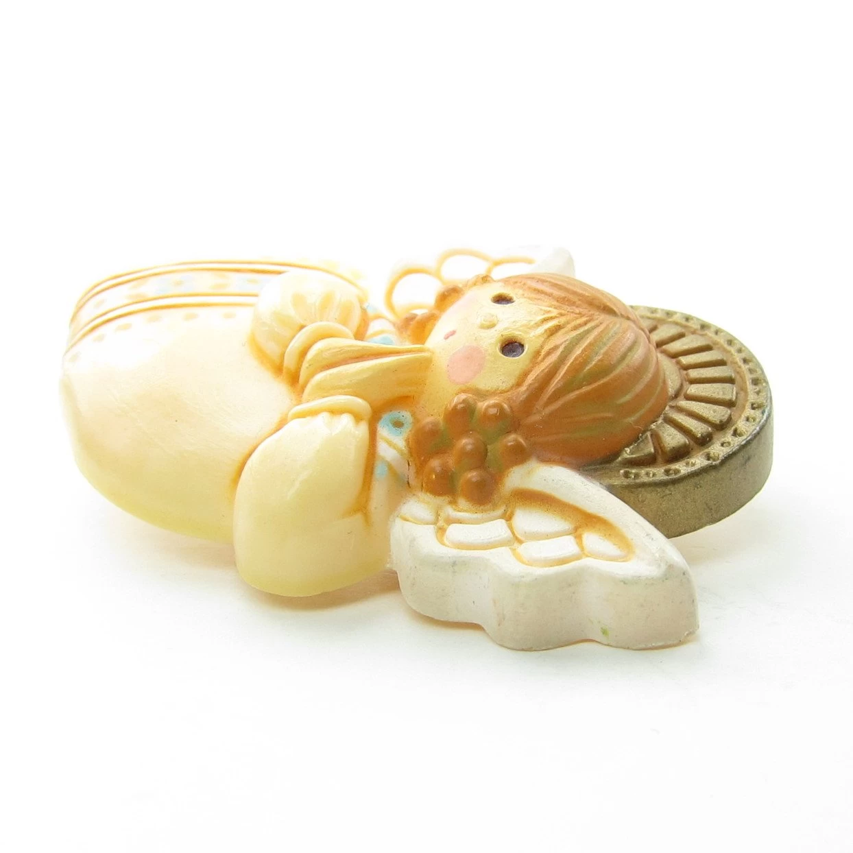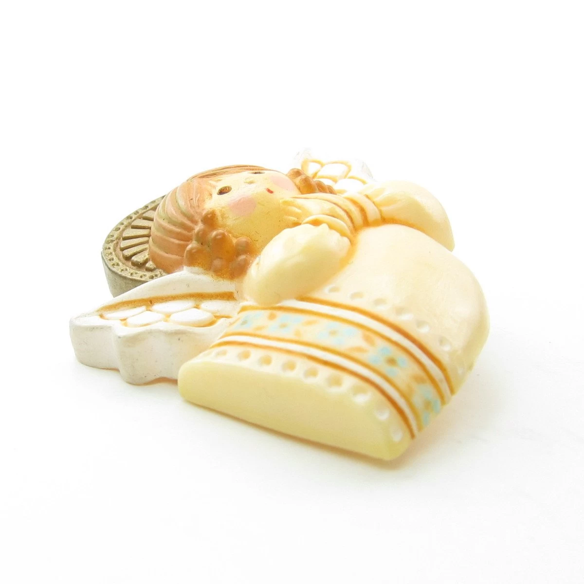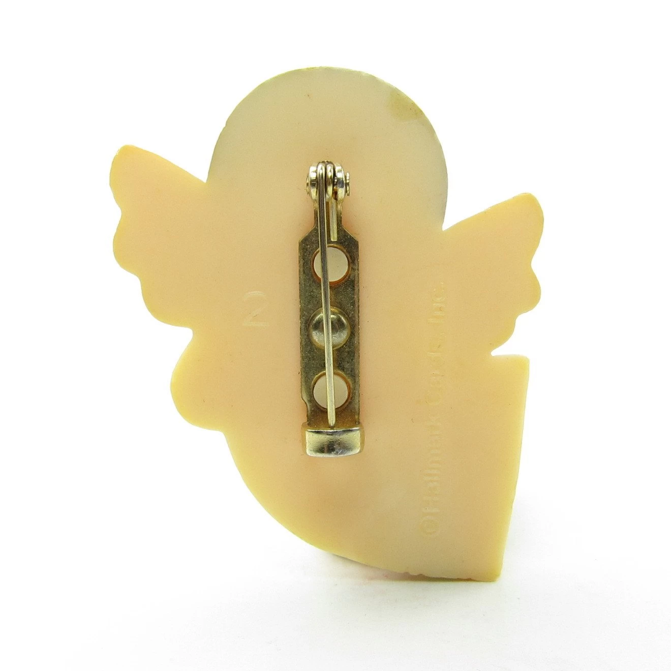 This vintage Hallmark pin features features a sweet little angel with brown hair and a halo wearing a beige dress and holding her hands together in prayer. She has white and brown wings, and her dress is flowing out to one side as she flies.