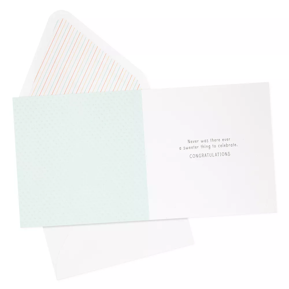 - Inside reads “Never was there ever a sweeter thing to celebrate. Congratulations”