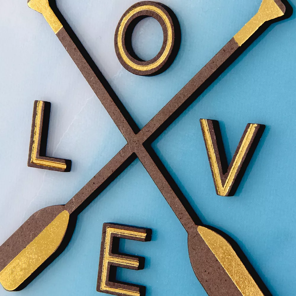 - Cover features a crisscrossed oars and “Love” lettering, accented with gold foil on a blue painted background