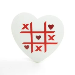This vintage Hallmark pin features a large white plastic heart with a tic-tac-toe design on the front. The pin has three hearts that used to light up and flash, but the light-up feature no longer works.