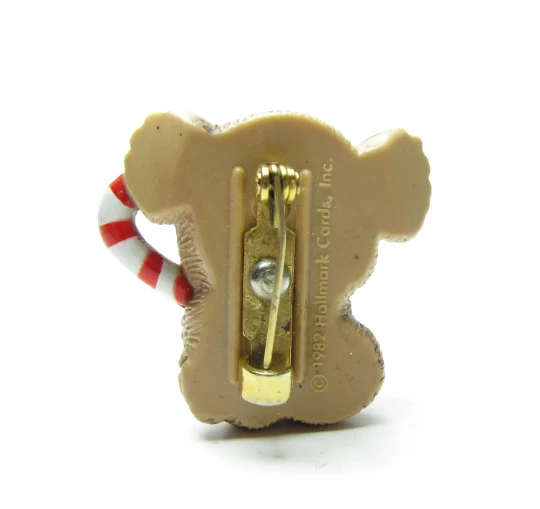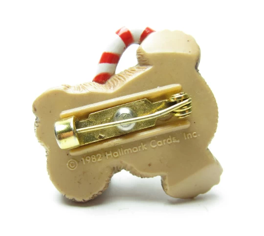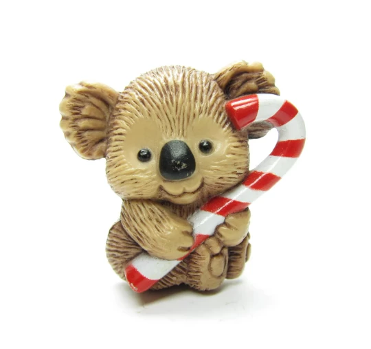 This vintage Hallmark pin from 1982 features a brown koala bear holding a striped candy cane. The koala bear has lots of texture and detail and such a sweet expression.