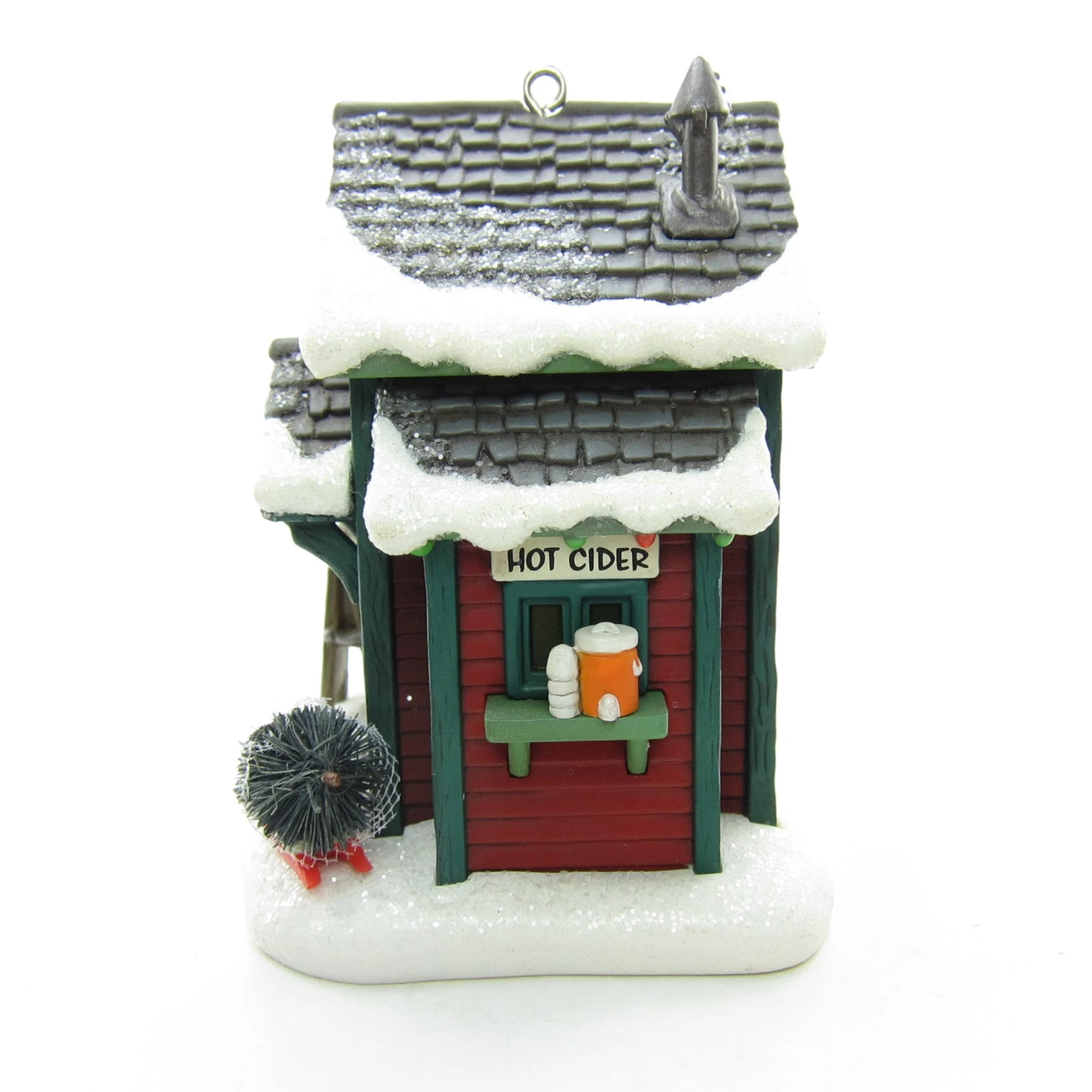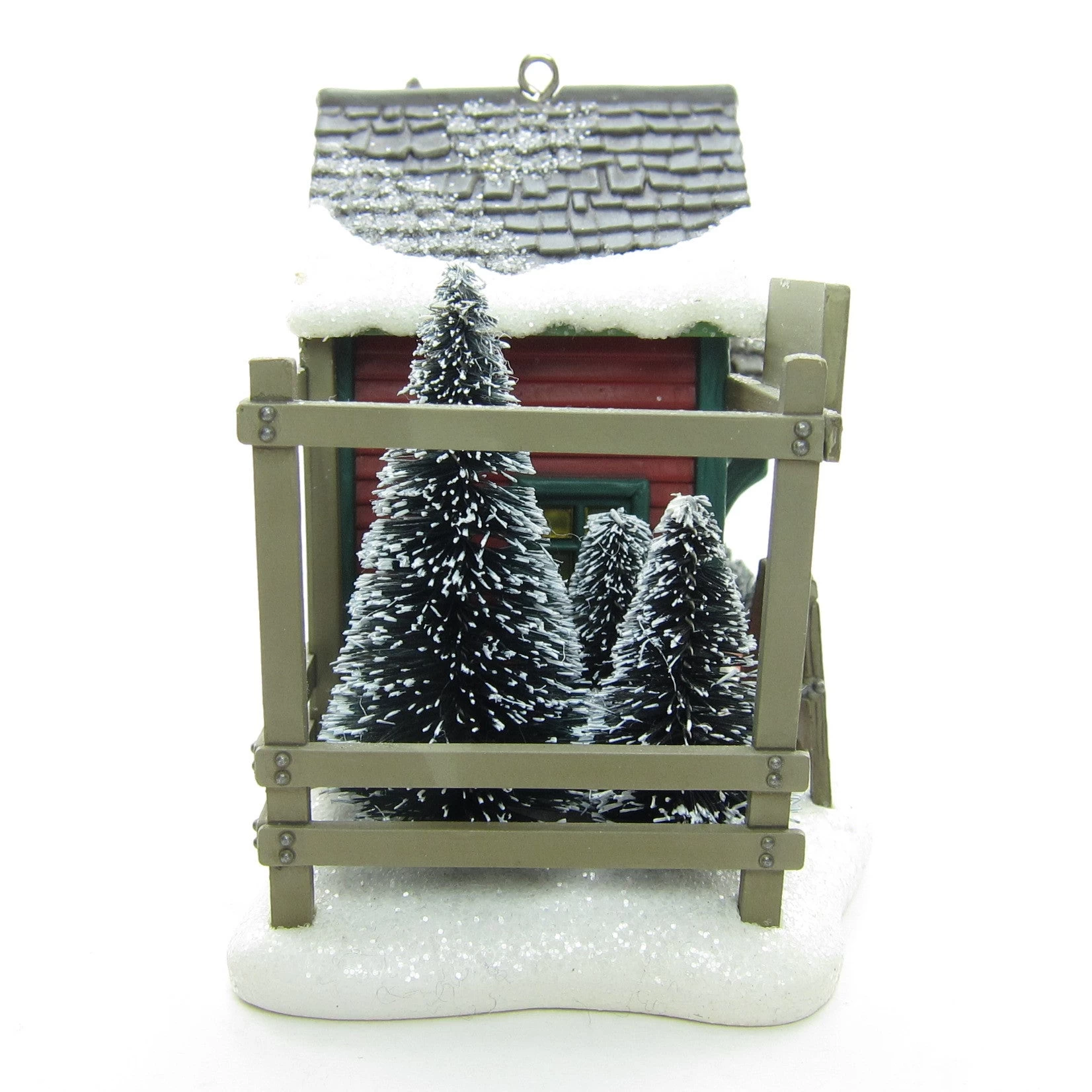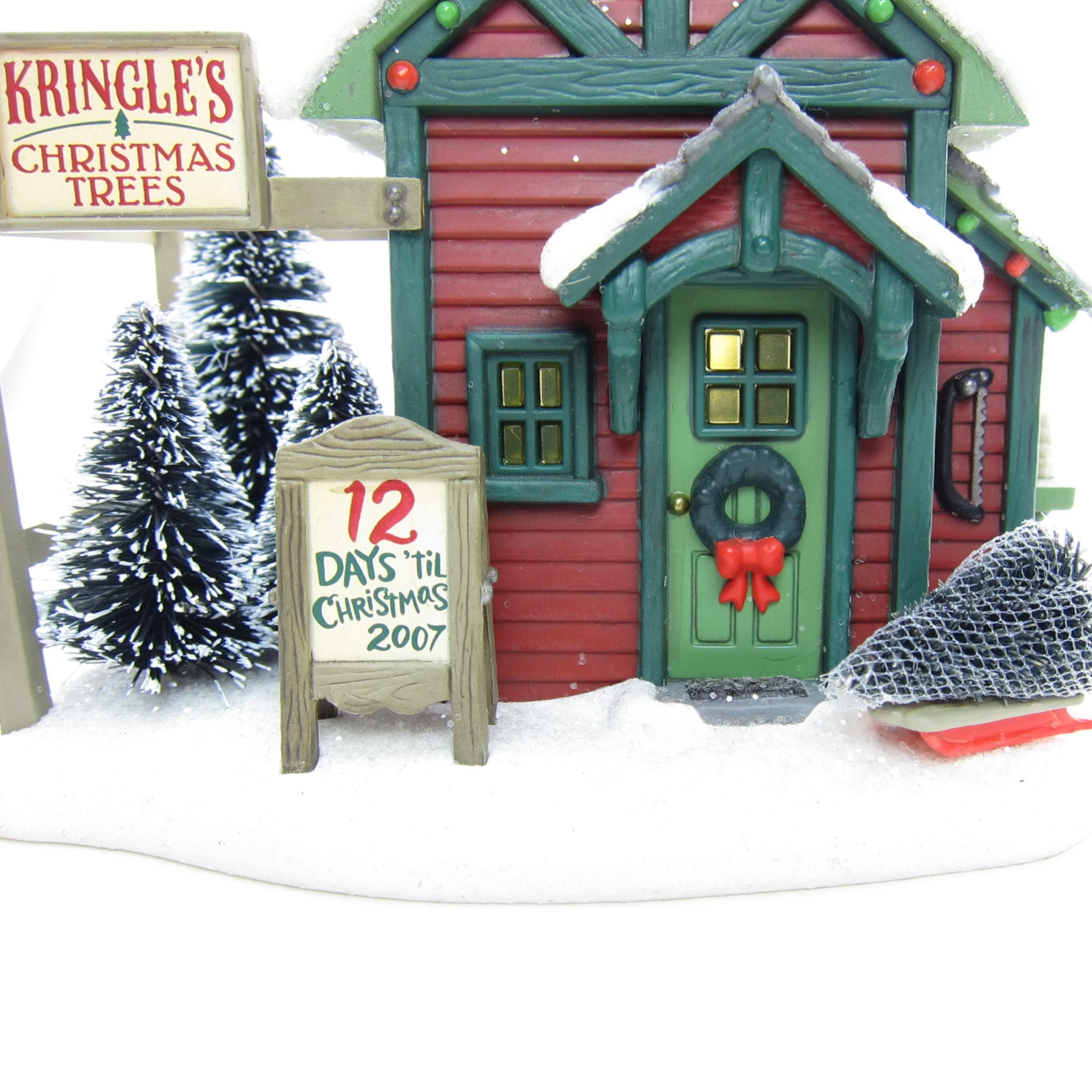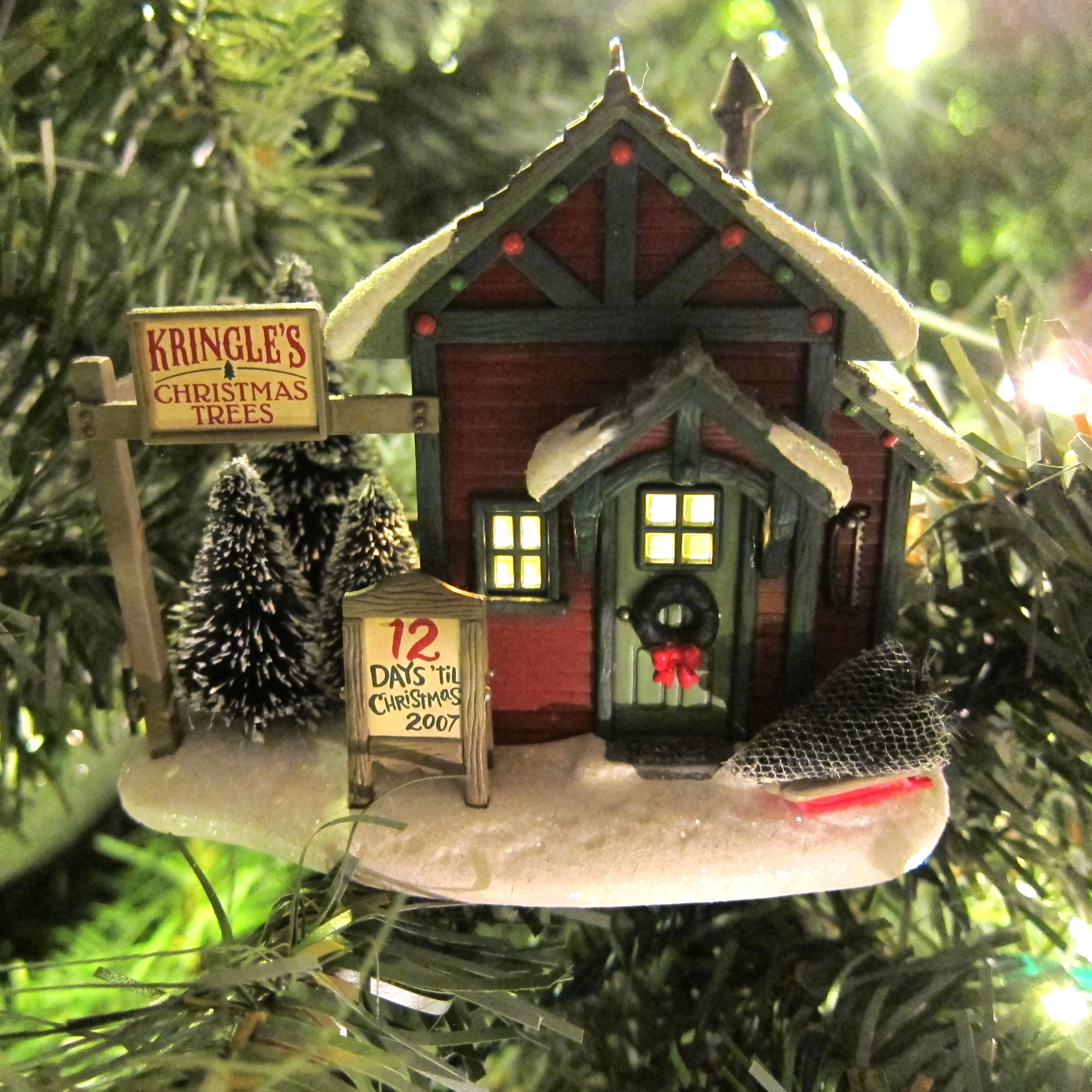 The ornament has lots of charming, realistic details. The snow around the building and on the roof is sprinkled with white glitter. The Christmas tree lot next to the building has bottle brush trees dusted with snow and there’s also a tree wrapped in netting on a sled near the door. A sign on the tree lot says “Kringle’s Christmas Trees” and a sign in front of the building says “12 Days ‘Til Christmas 2007.”