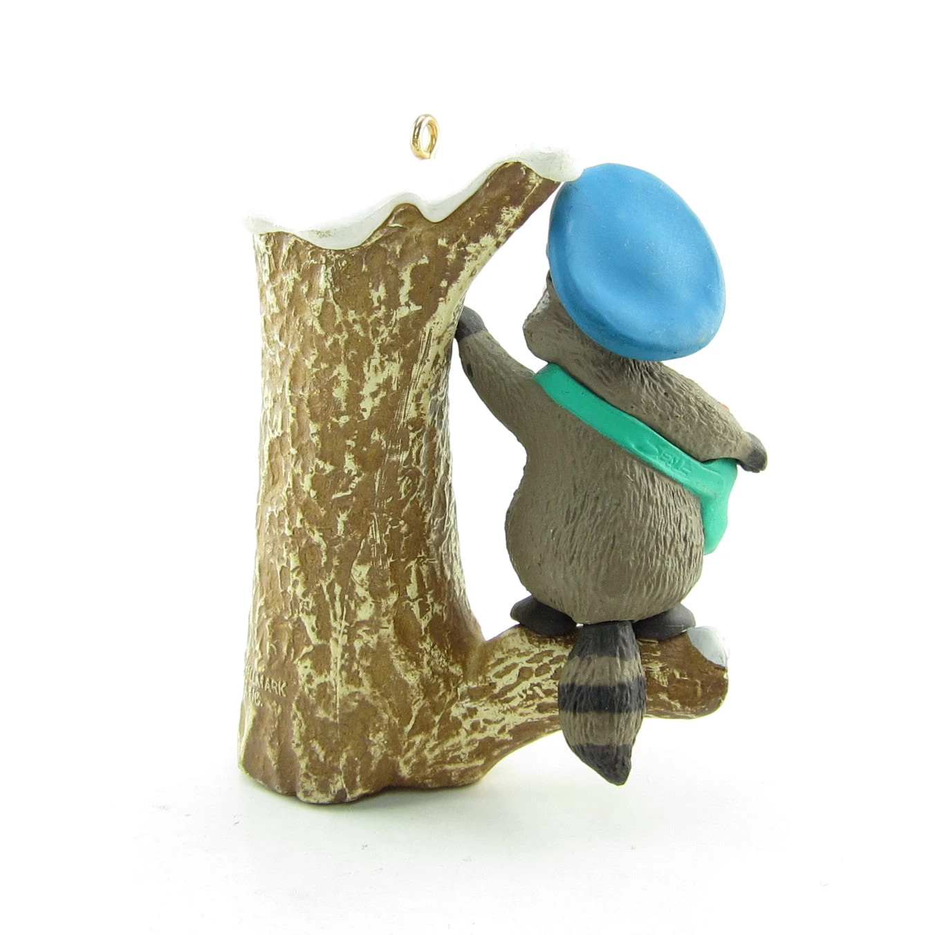 This vintage Hallmark Keepsake Ornament is the Mail Call Christmas tree decoration from 1989. It features a raccoon mail carrier delivering mail to a mailbox made from a tree stump. There’s snow on top of the stump and a little red bird on a branch.