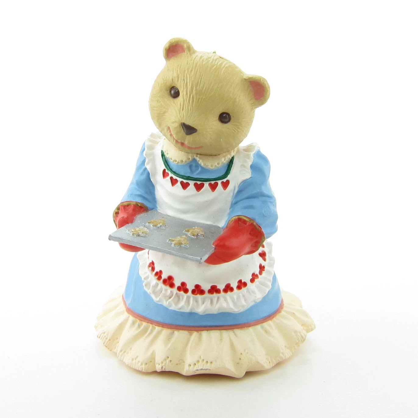 This vintage Hallmark Keepsake Ornament is Mama Bearinger, she’s #2 in The Bearingers of Victoria Circle series from 1993. She’s a sweet tan colored bear in a fancy dress and apron and is leaning over with a pan of freshly baked cookies. The cookies are shaped like Christmas trees and are dusted with real glitter, so they sparkle.