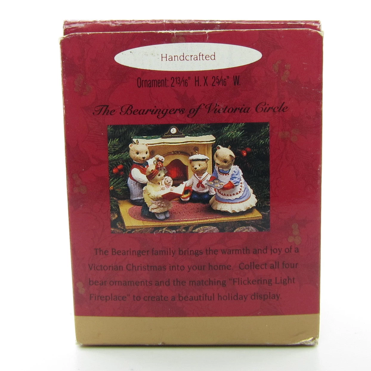 There were four ornaments in The Bearingers of Victoria Circle series – Papa Bearinger, Mama Bearinger, and their two children, son Abearnathy Bearinger and daughter Bearnadette Bearinger. There was a lighted tabletop display shaped like a fireplace with raised pegs on it and each ornament had an indented shape on the bottom so it could fit on the pegs.