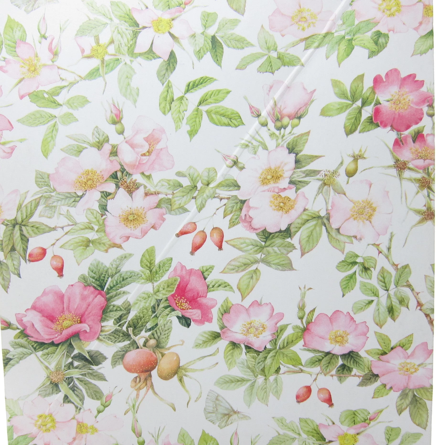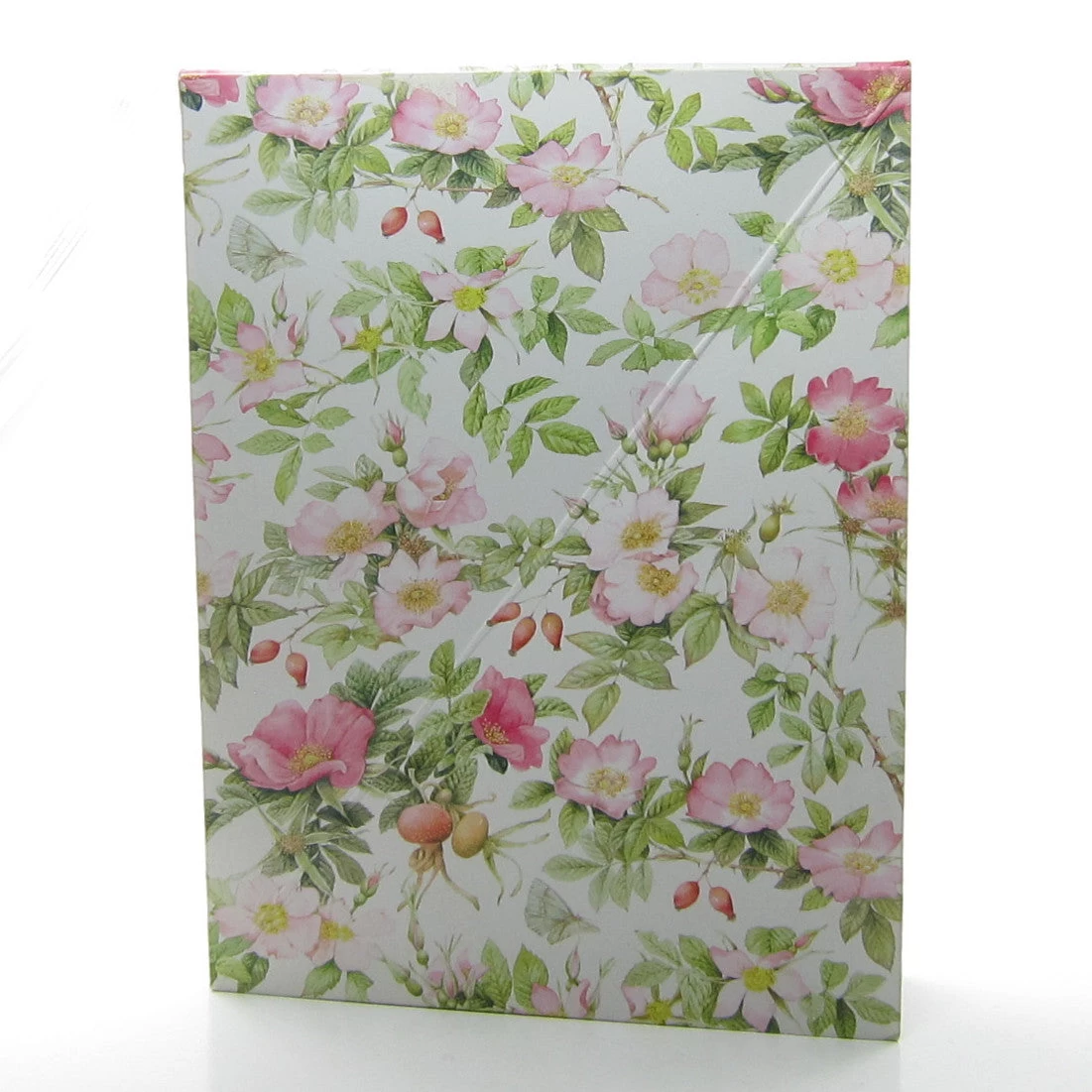 This vintage 4 x 6 picture frame from Hallmark features artwork by Marjolein Bastin. The pattern has light pink and dark pink wild roses and rose hips. The frame is made of thick paper over foam and has an easel on the back. The frame can be used vertically or horizontally.