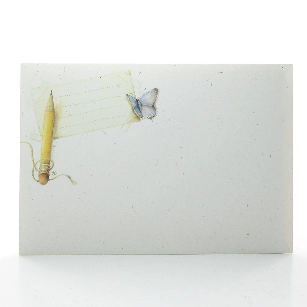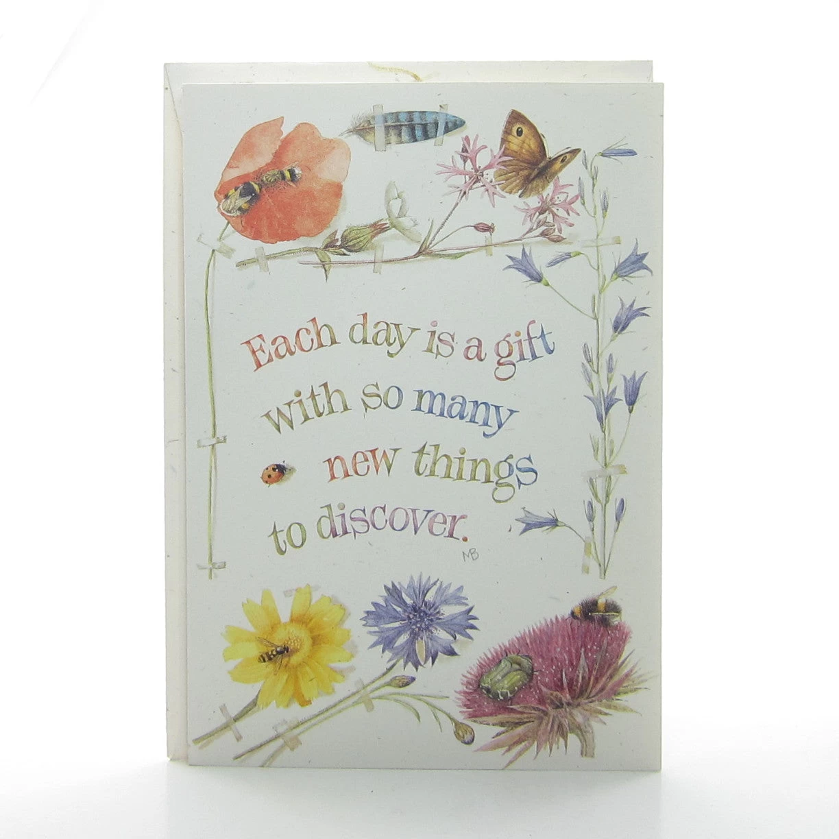 This vintage greeting card from Hallmark features the artwork of Marjolein Bastin and has a border with flowers and insects around the edge. The handpainted lettering on the front says “Each day is a gift with so many new things to discover.” The card is unused and comes with its original envelope.