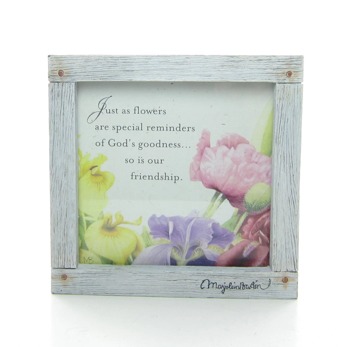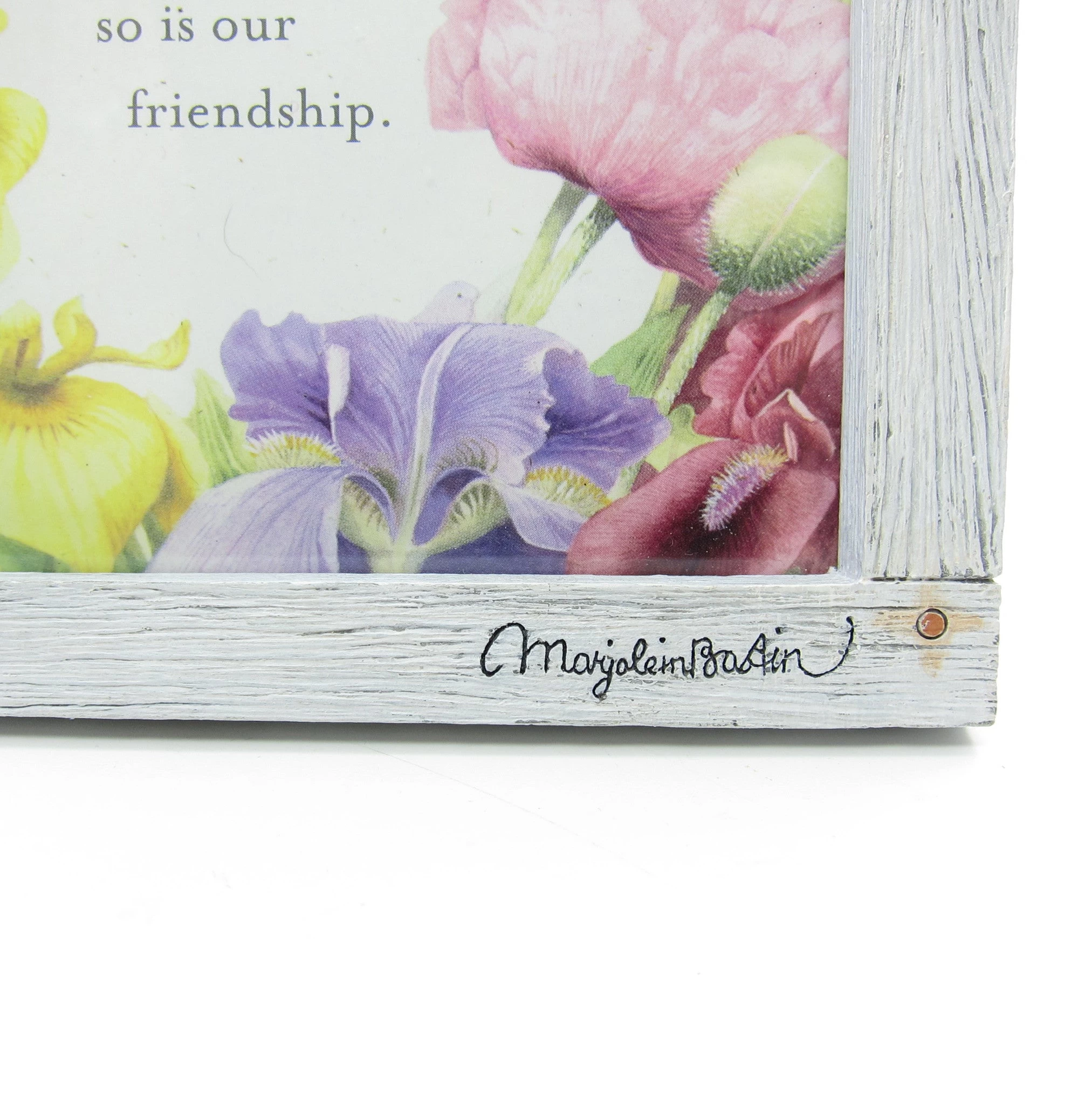 This vintage picture frame from Hallmark features the artwork of Marjolein Bastin and has a quote about friendship. There’s a watercolor painting of purple and yellow irises and pink poppies. The quote says “Just as flowers are special reminders of God’s goodness…so is our friendship.”