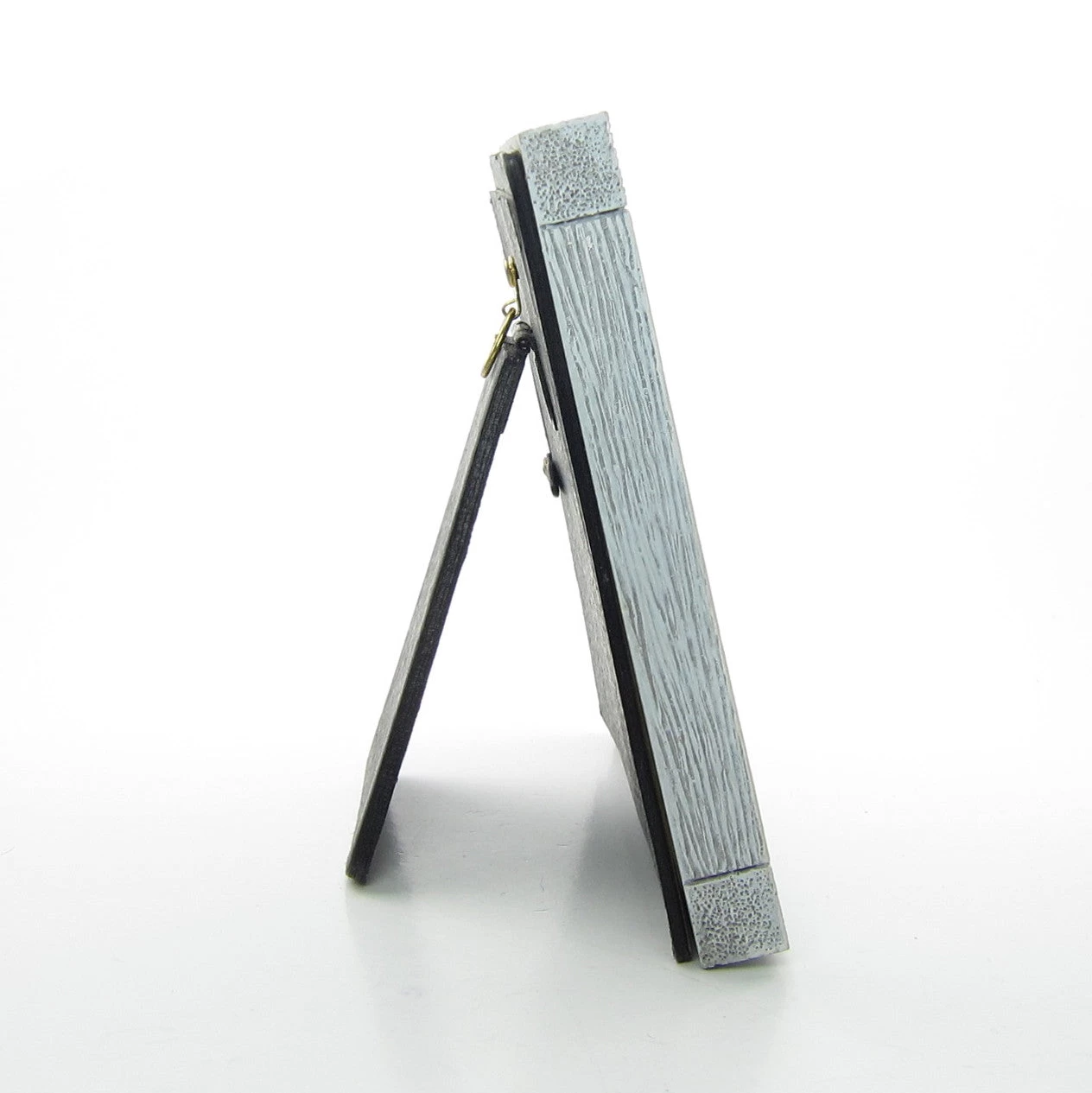 The frame is made of resin but is textured to look like weathered grey wood held together with rusted metal nails. It has Marjolein Bastin’s signature on the front. The back has a metal ring for hanging on the wall or a hinged stand for displaying on a shelf. The back of the frame opens up and the art print could be replaced with a photo.