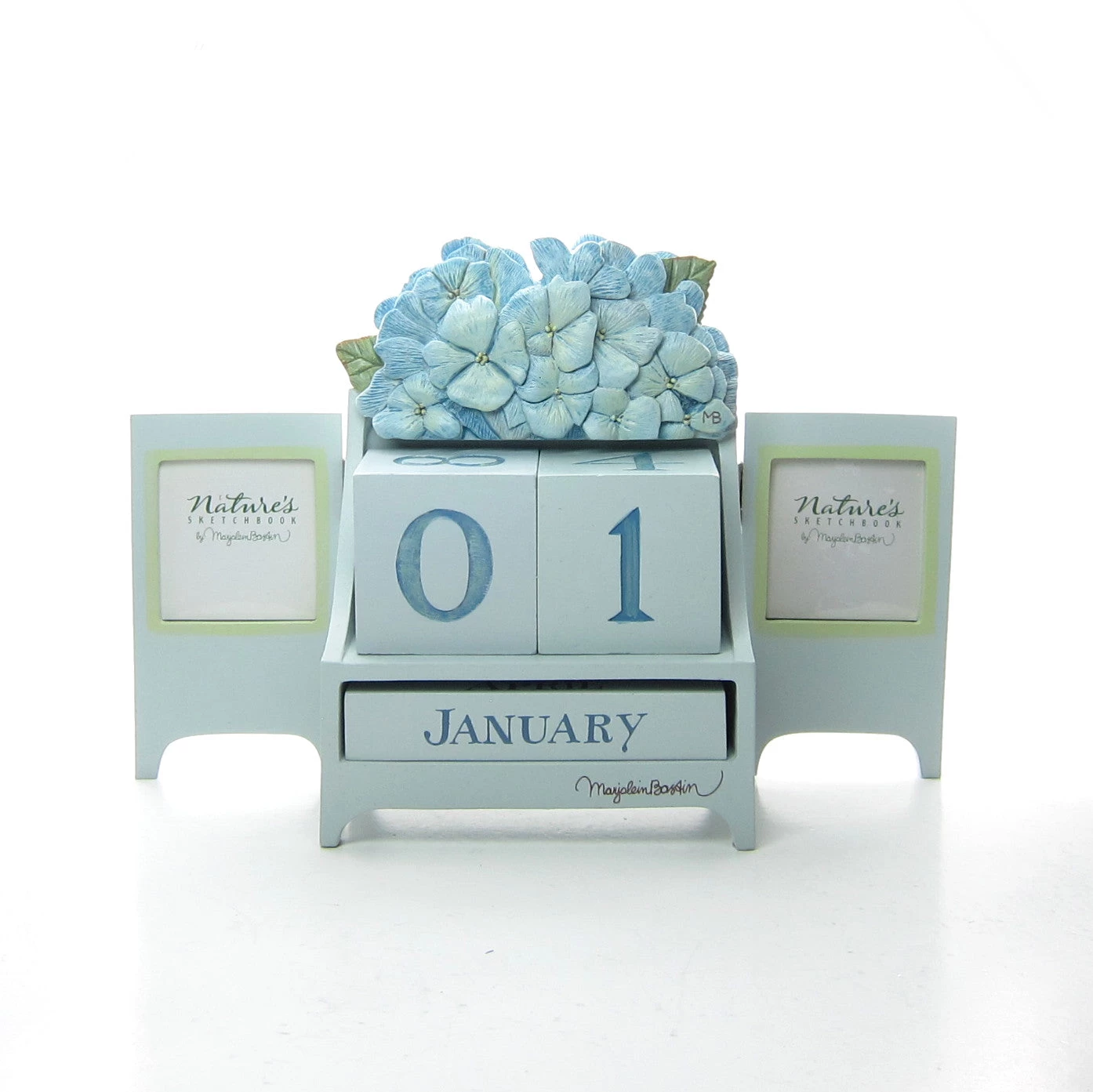 This vintage perpetual calendar with photo frames from Hallmark features the artwork of Marjolein Bastin and has blocks for each month and day of the year. The calendar is light blue and has blue hydrangeas on the back. The date and month blocks have dark blue writing. There are picture frames on hinges that fold out on each side of the calendar and can fold back in when not in use.