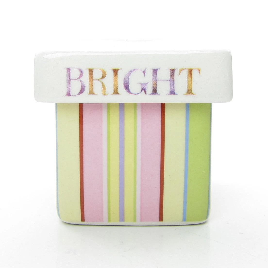 The trinket box has yellow, red, pink, green, and purple stripes. Inside the bottom, it says “Each pansy brings a loving thought” in cursive.