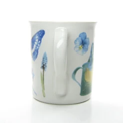 The soap or lotion dispenser is white with a blue stripe around the top and has images of a European robin, blue pansies, ladybugs, a garden trowel, a garden trug, blackberries, bees, butterflies, blue feathers, strawberries, plant pots, blue speckled eggs, and red berries. The same design is printed on both sides. There’s also a bee at the top of the dispenser.