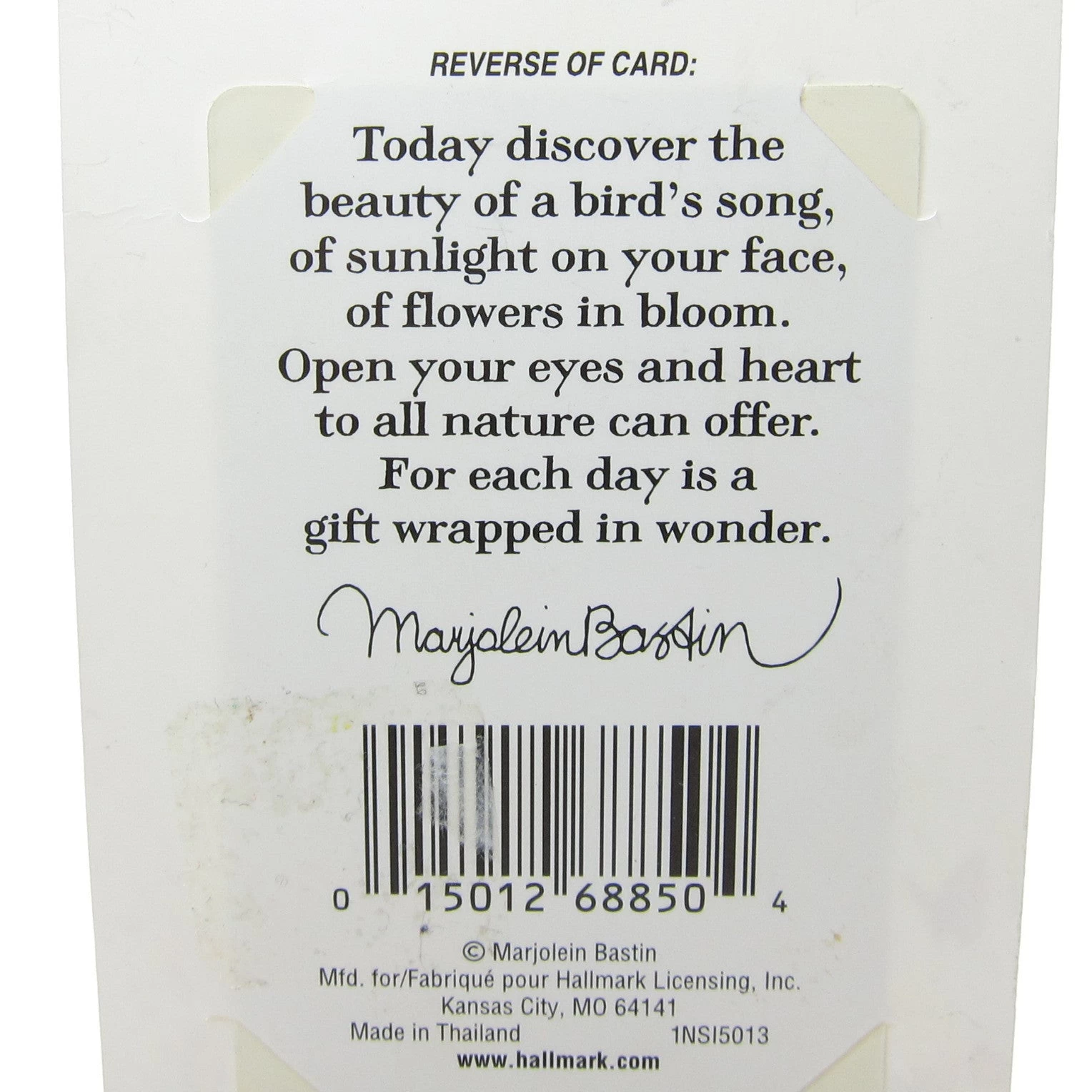 The front of the card reads “Each day is a gift with so many new things to discover.” The back reads “Today discover the beauty of a bird’s song, the sunlight on your face, of flowers in bloom. Open your eyes and heart to all nature can offer. For each day is a gift wrapped in wonder.” and has Marjolein Bastin’s signature.