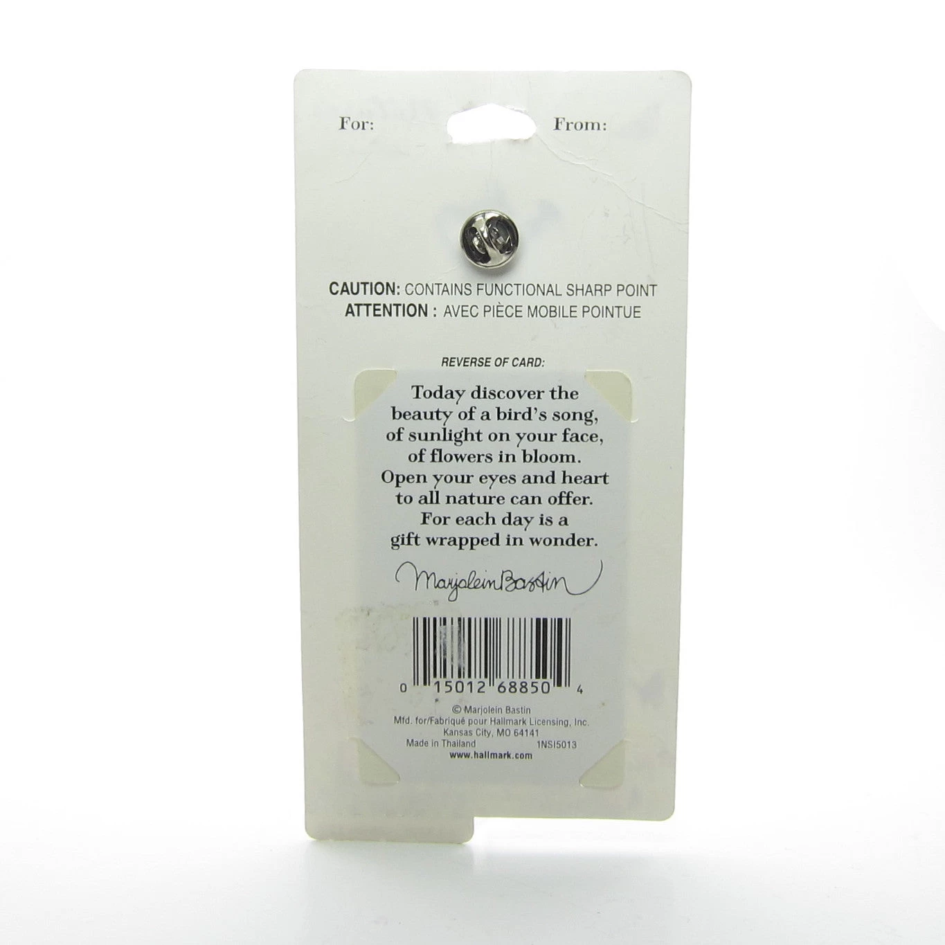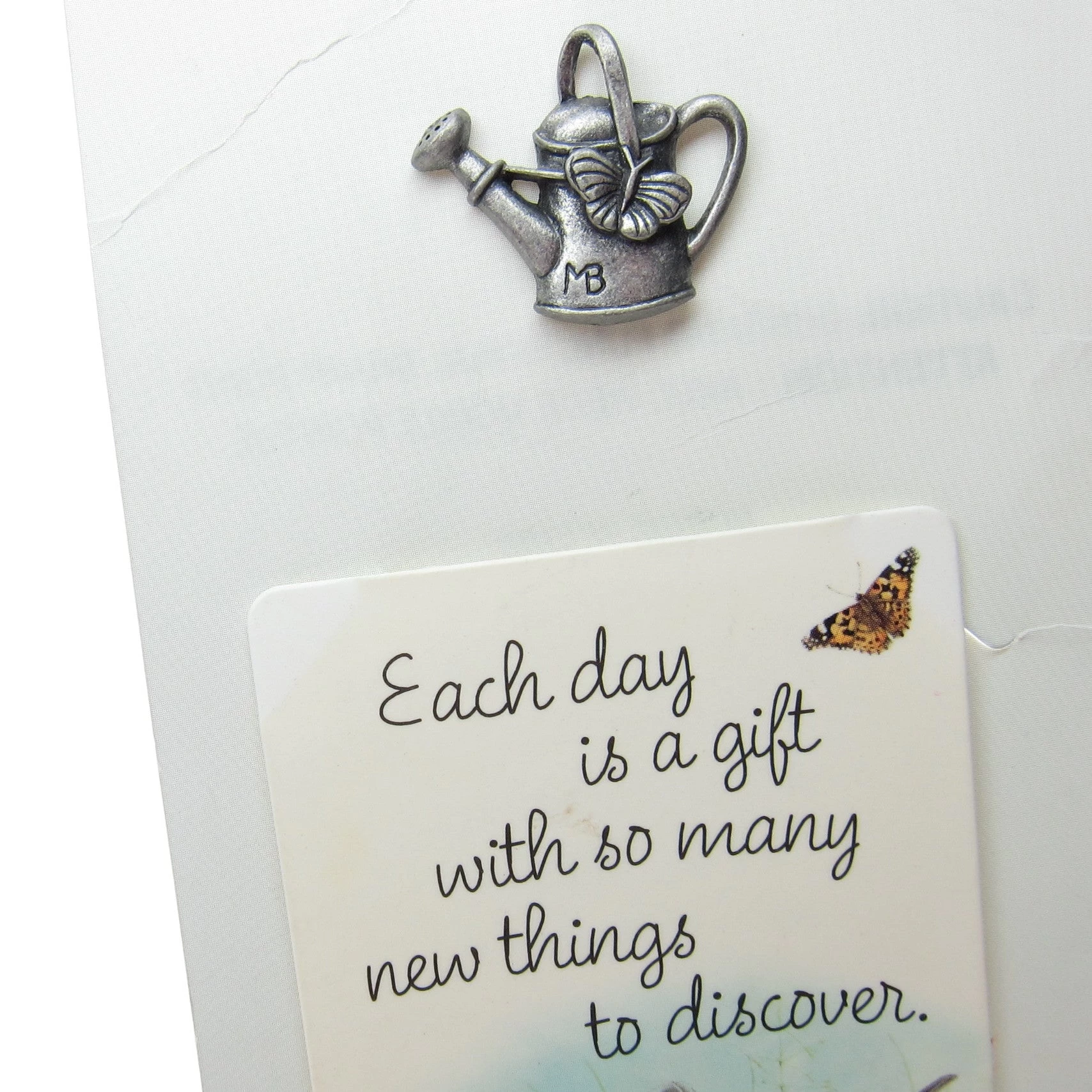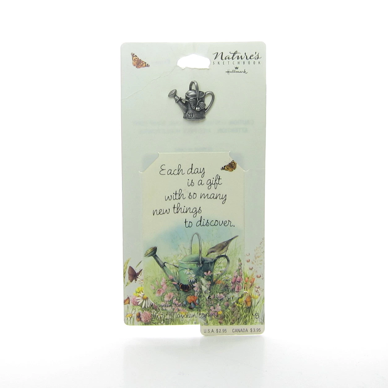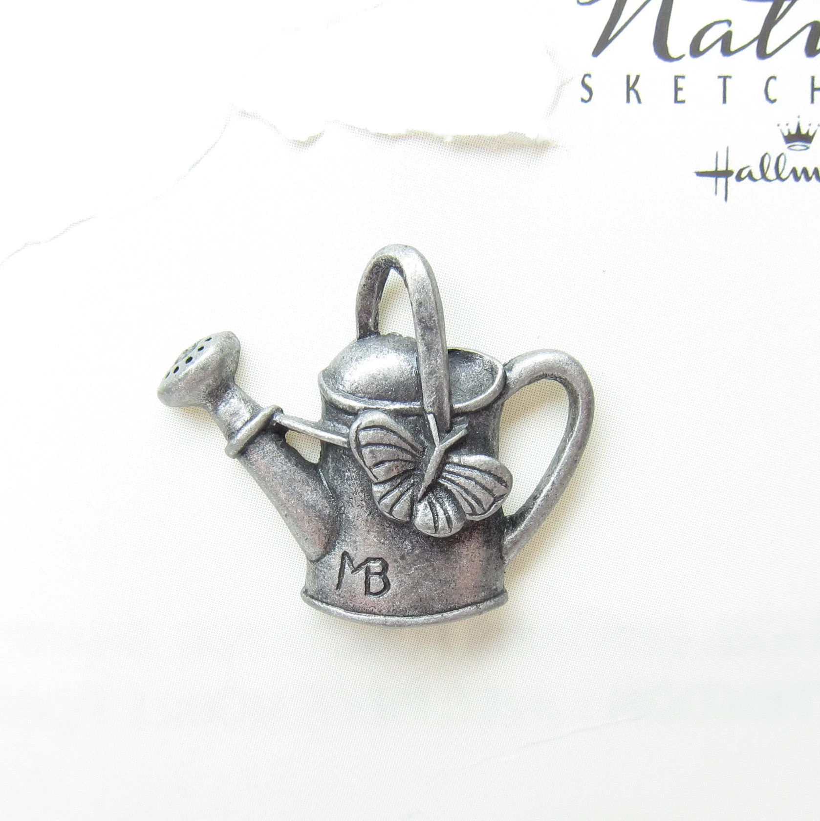 This vintage pin and card set from Hallmark features the artwork of Marjolein Bastin. It includes a small pewter pin shaped like a watering can and a small plastic card with an illustration of a watering can in a field of wildflowers. There’s a bird perched on the handle of the watering can and butterflies flitting around the flowers. The pin and card are still attached to the original backcard.