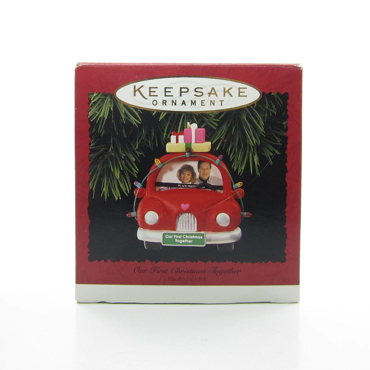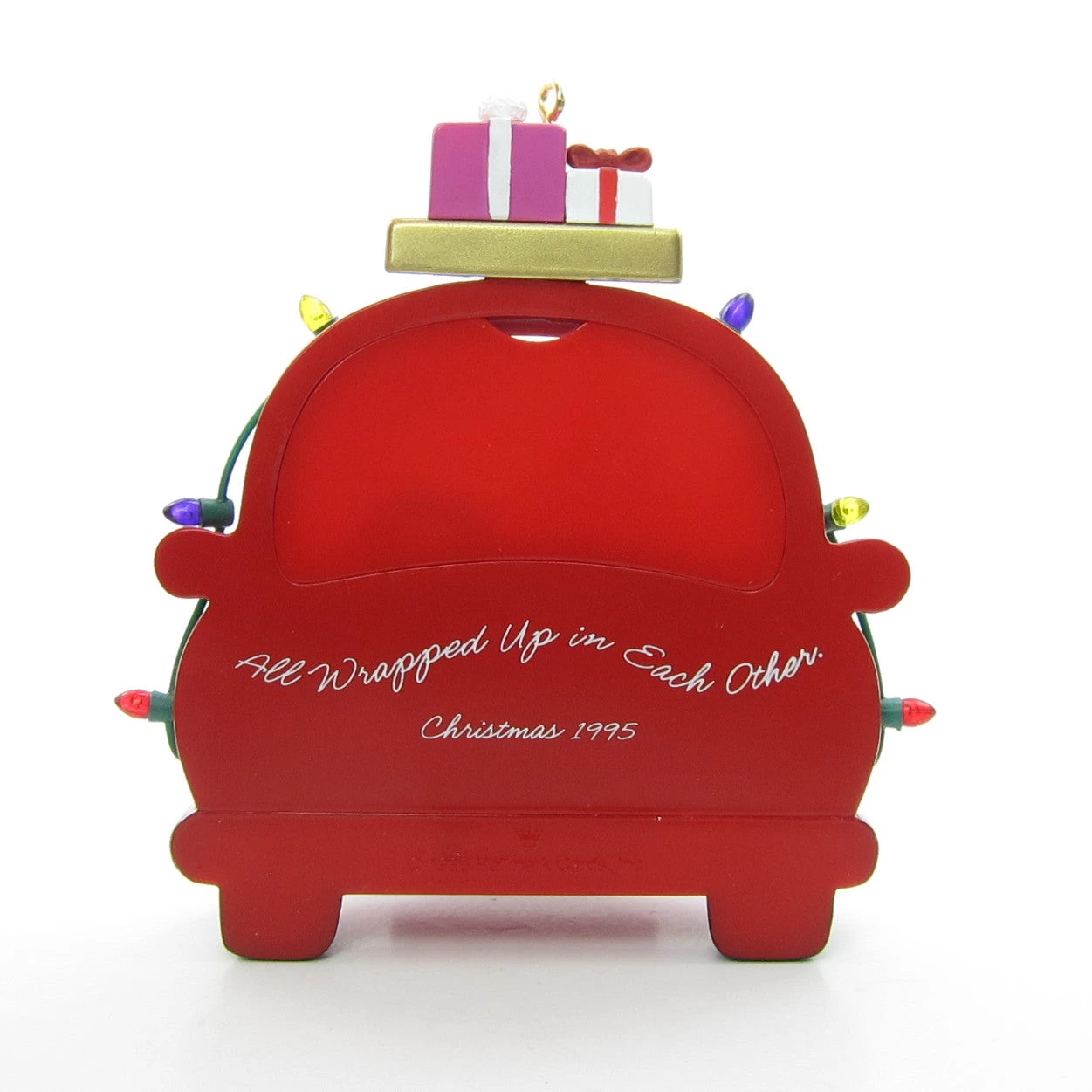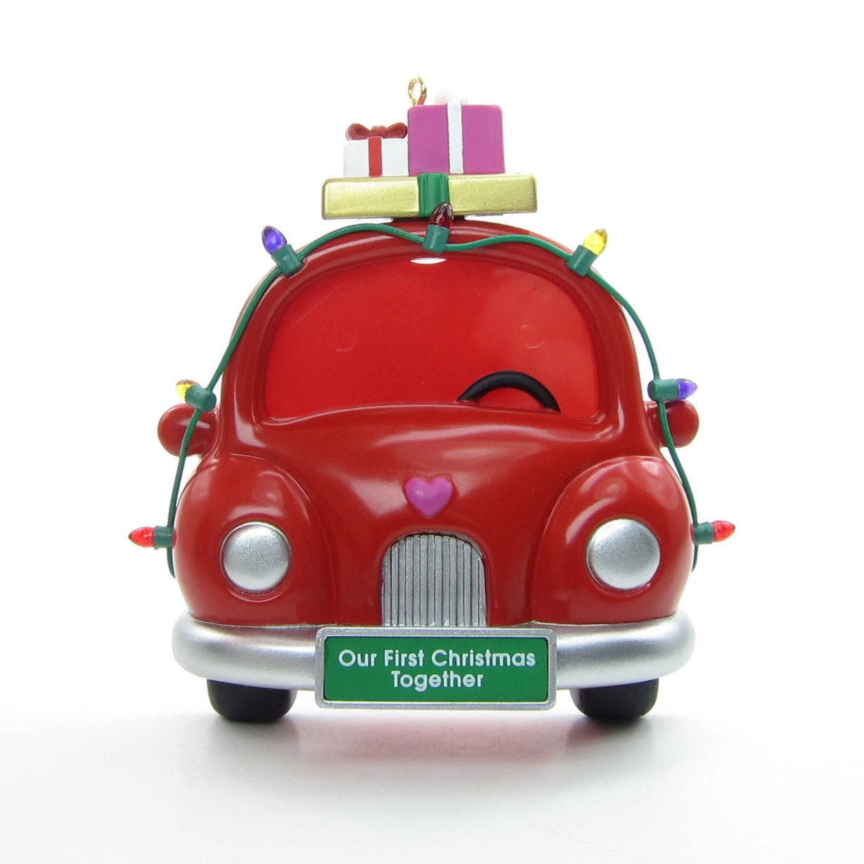 This vintage Hallmark Keepsake Ornament from 1995 is shaped like a car and says “Our First Christmas Together” on the license plate. The style of the car is similar to a Volkswagen Beetle or Bug and there’s a heart on the front where the hood ornament would be. There are presents piled on top and a string of Christmas lights draped over the top and sides.