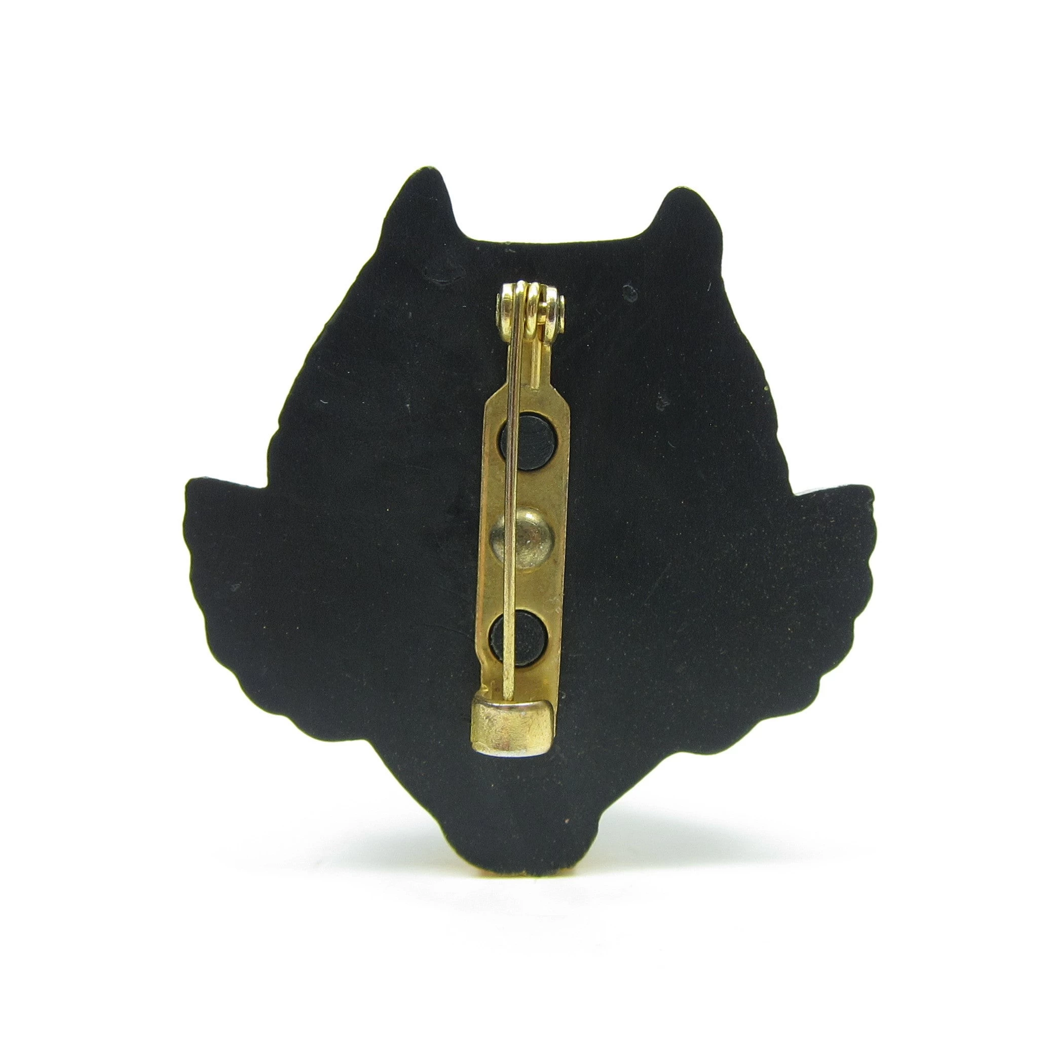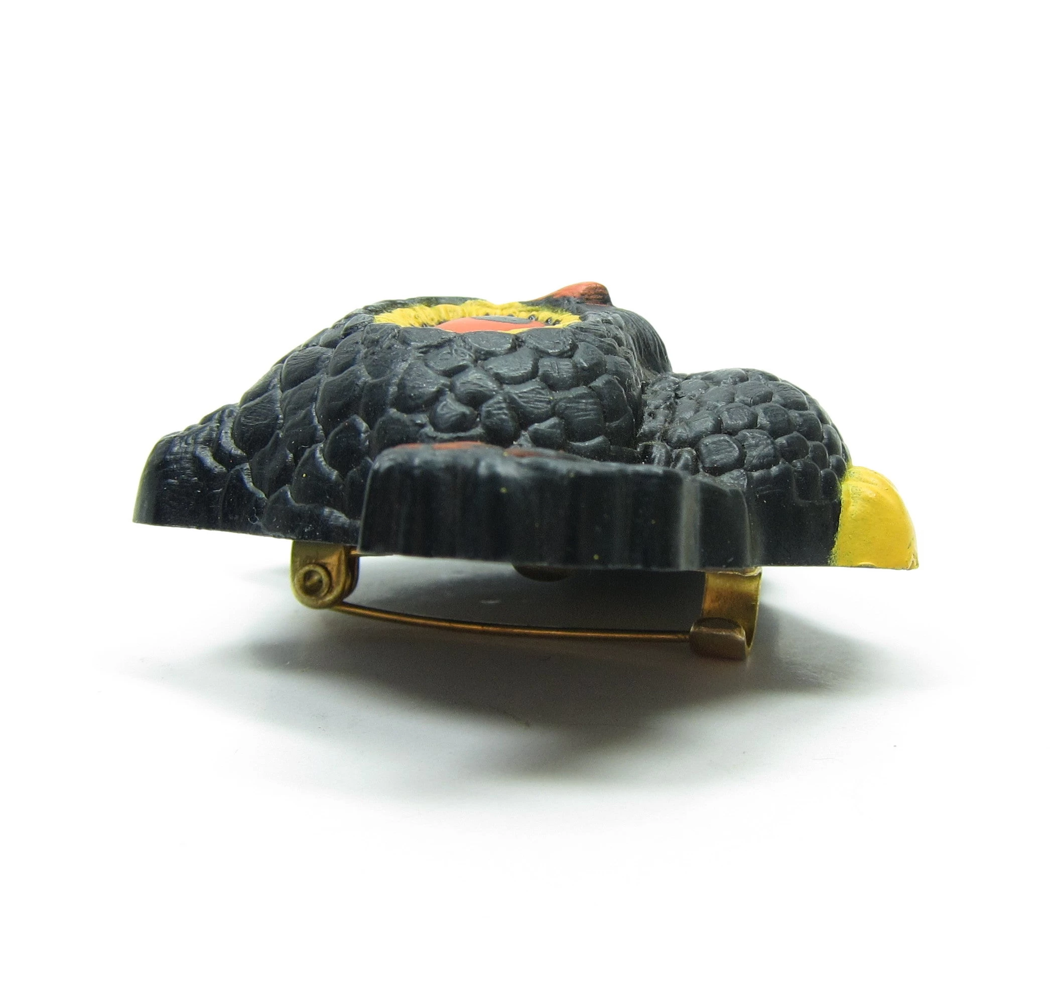 This vintage Hallmark pin features a black plastic owl with its wings spread wide and yellow and orange features. It has charming bright orange eyes.