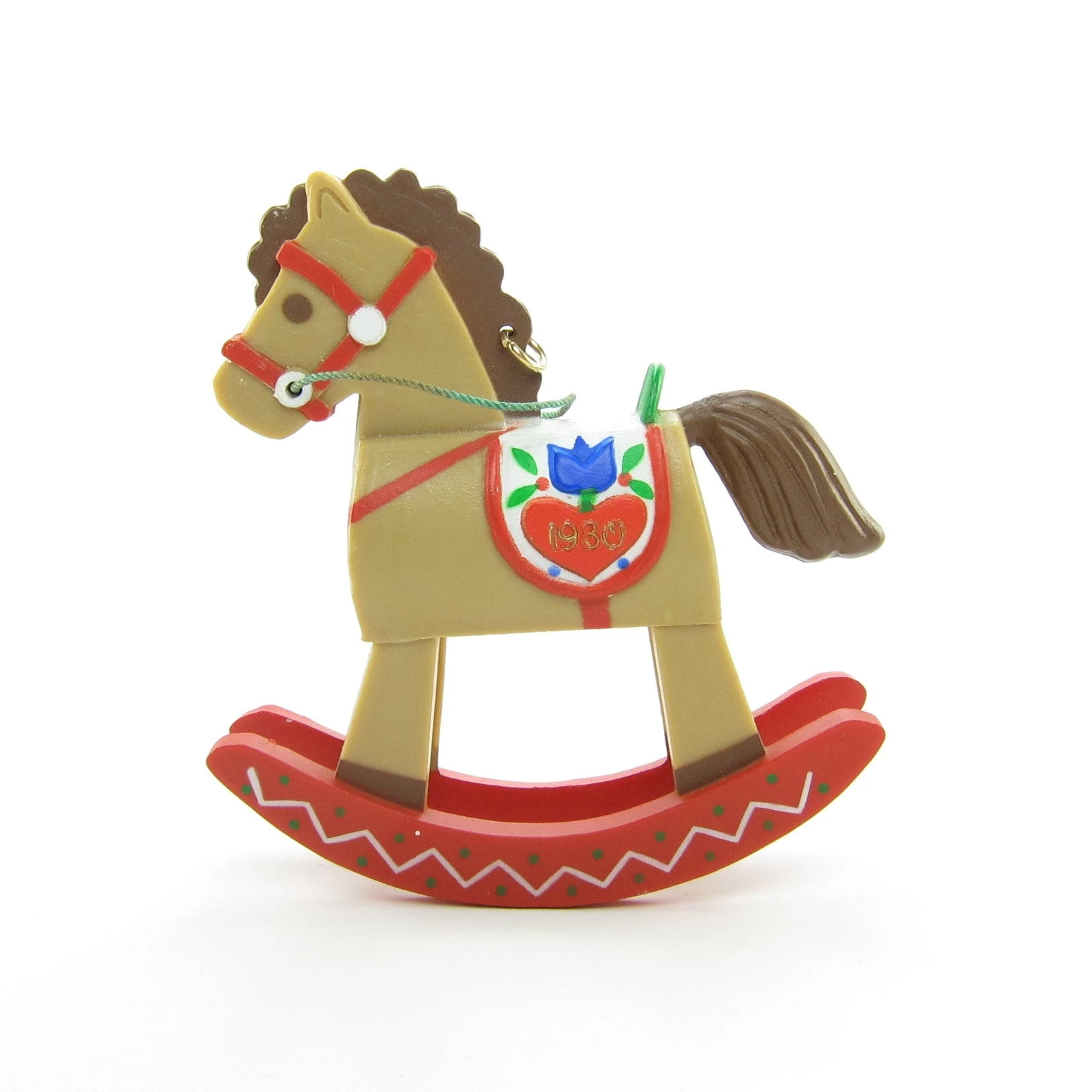 This vintage Hallmark Keepsake Ornament features a rocking horse from Christmas 1980. The rocking horse is light brown with a dark brown mane and tail and has a saddle with Scandinavian style folk art designs.