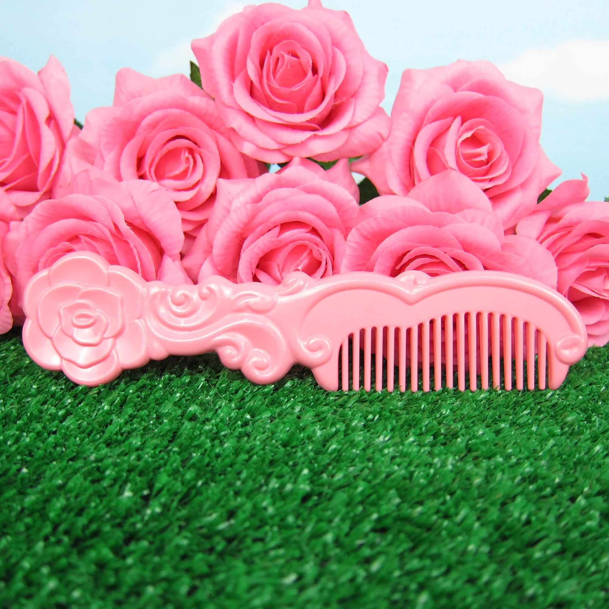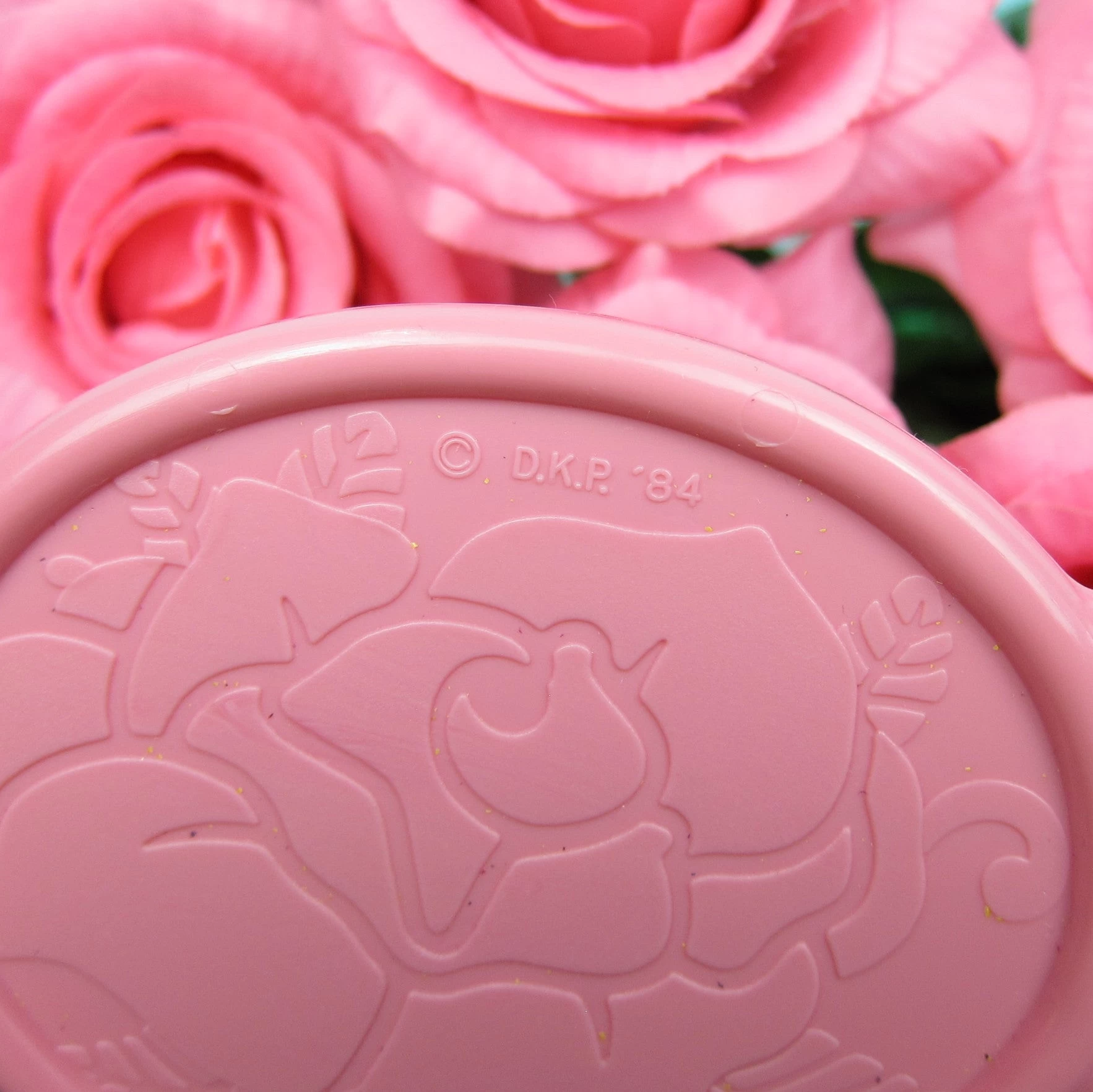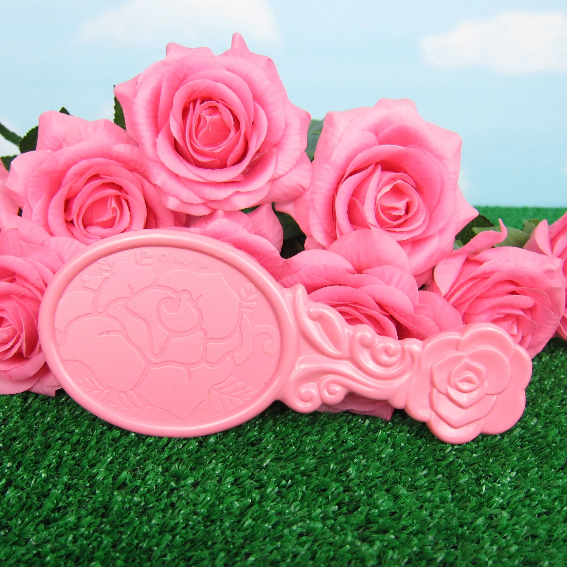 The pink hand mirror and comb both have rose designs on the handle. There are some areas around the edge of the mirror that are blue, as shown in the photos. Both pieces are marked “D.K.P. ’84.”