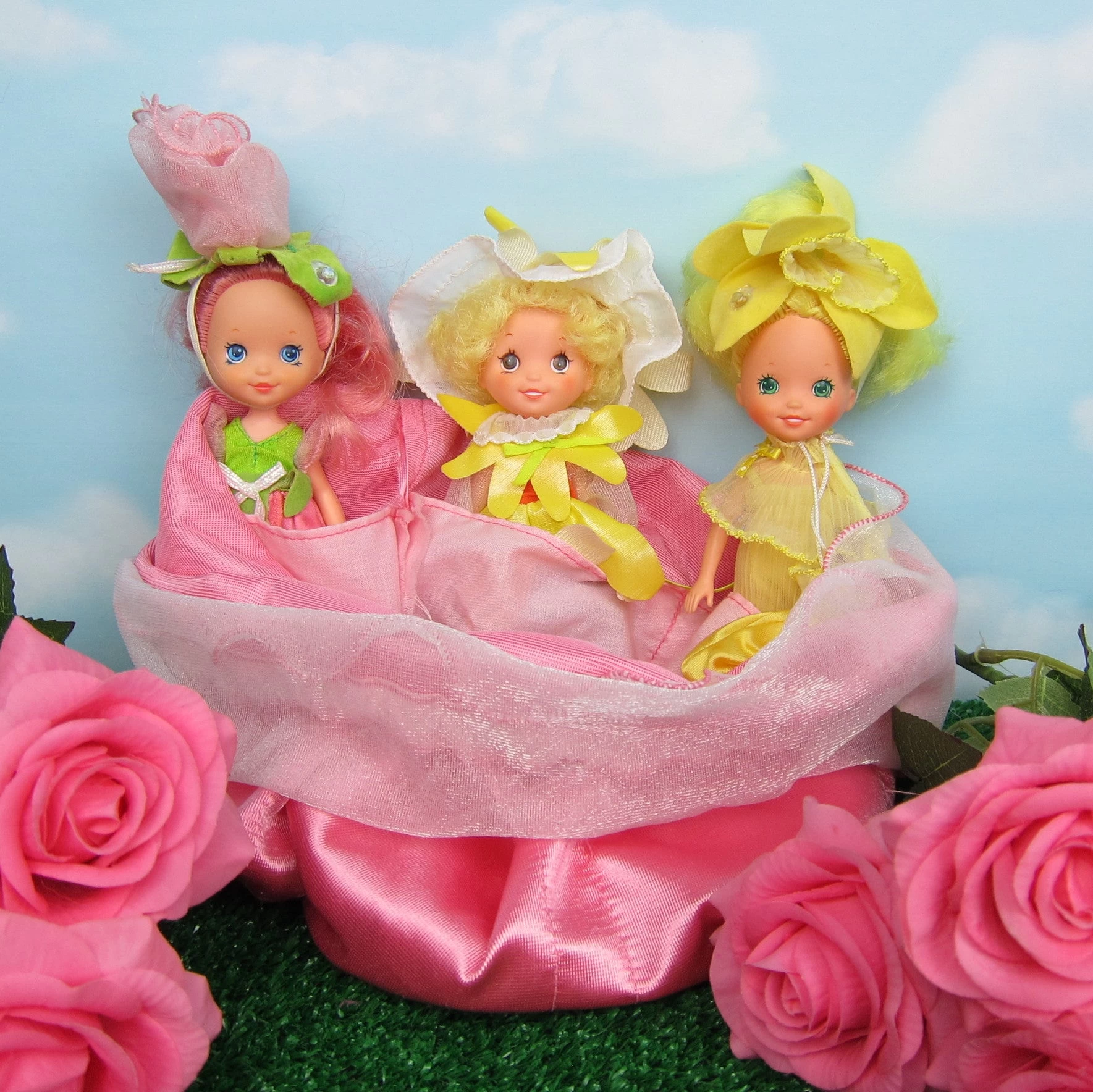 This rare vintage Rose Petal Place purse is made of silky fabric and comes with a pink hand mirror and comb. The inside of the purse has six pockets for storing and carrying Rose Petal Place dolls.