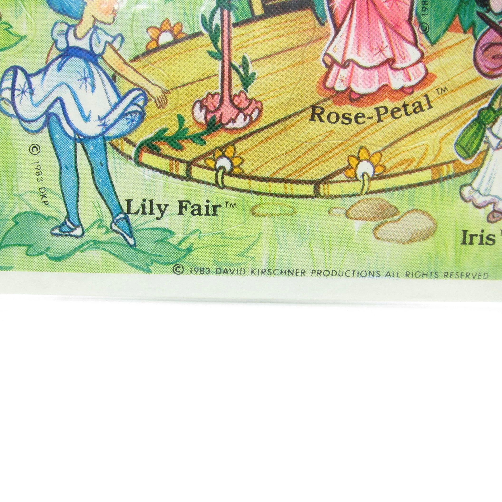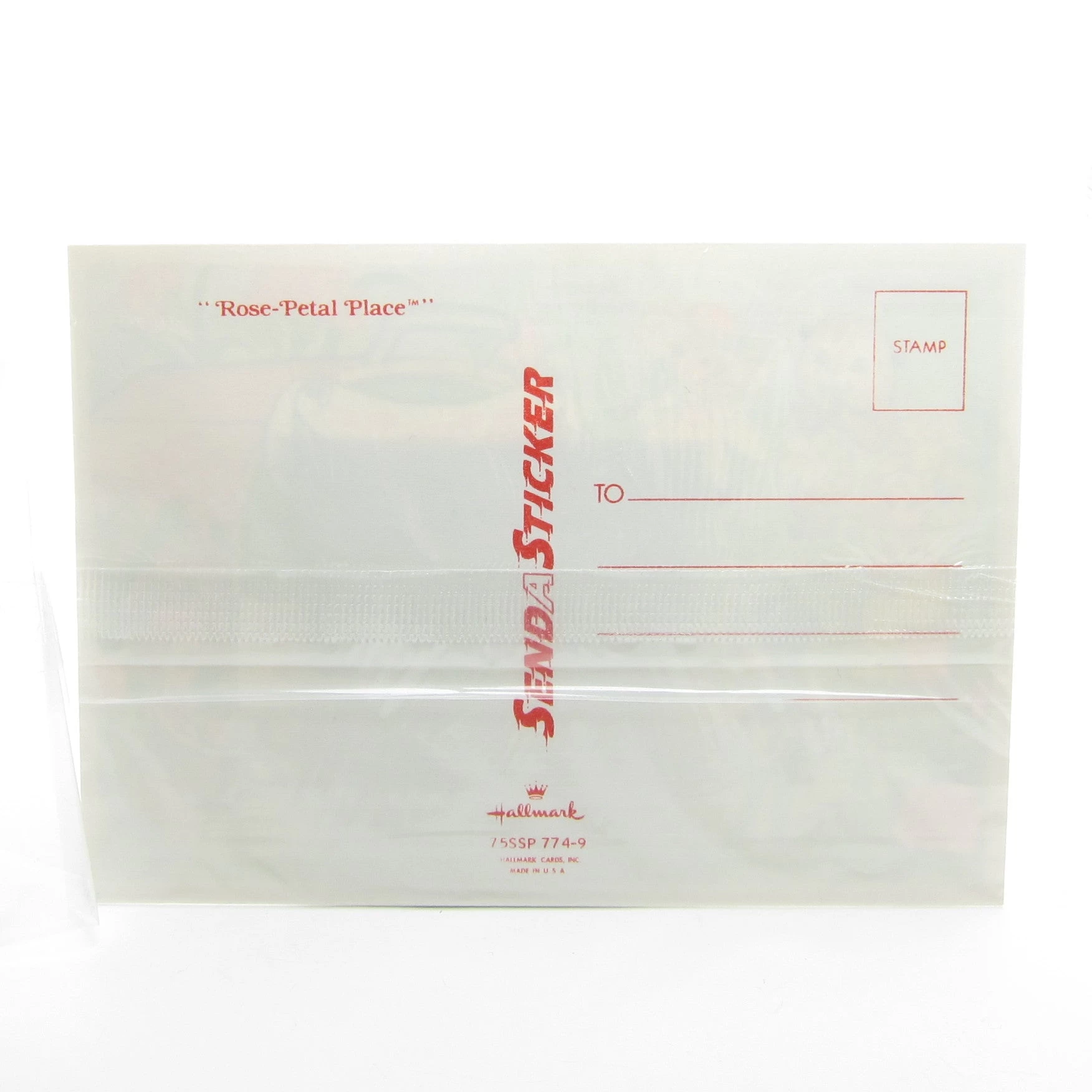 This vintage Hallmark Send A Sticker postcard has a pretty scene on the front featuring Rose Petal Place characters. Each character is a sticker and also has the character’s name.