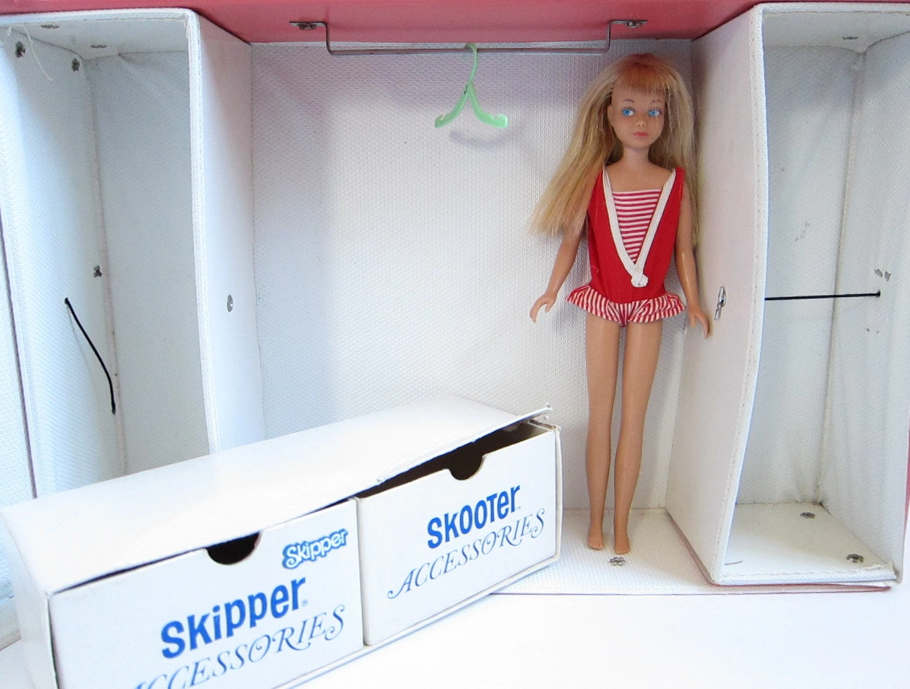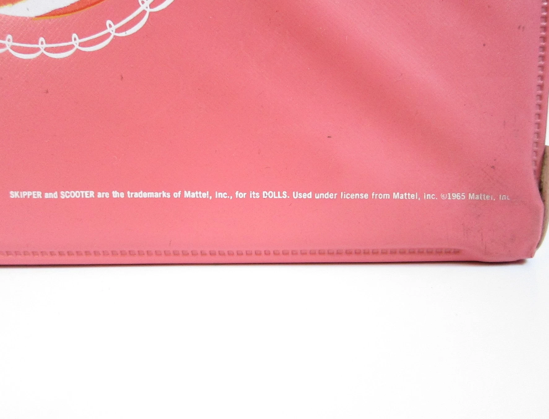 The front of the case is marked “SKIPPER and SCOOTER are the trademarks of Mattel, Inc. for its DOLLS. Used under license from Mattel, Inc. 1965.” This part has Scooter spelled with a “C,” but the main design on the front of the case shows it spelled with a “K” instead.