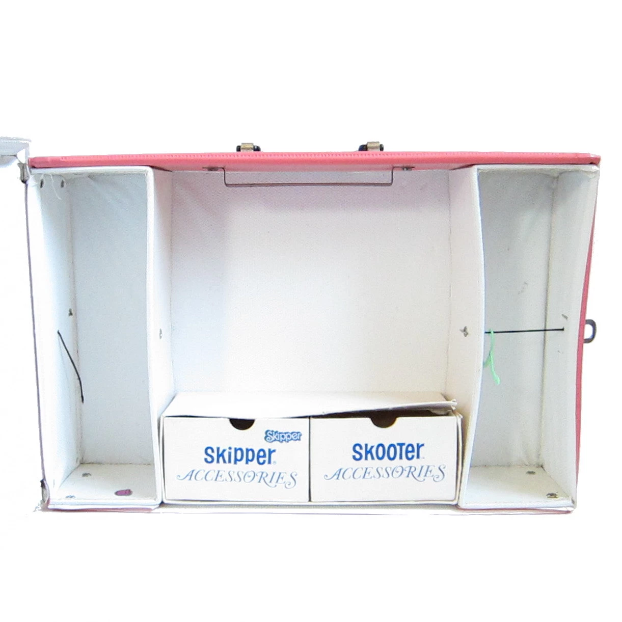 Inside the case there are compartments on both ends to store dolls. There’s also a large compartment in the center with a metal rod on top for hanging clothes. Inside the large compartment is a cardboard insert with two drawers, one for Skipper accessories and one for Skooter accessories.