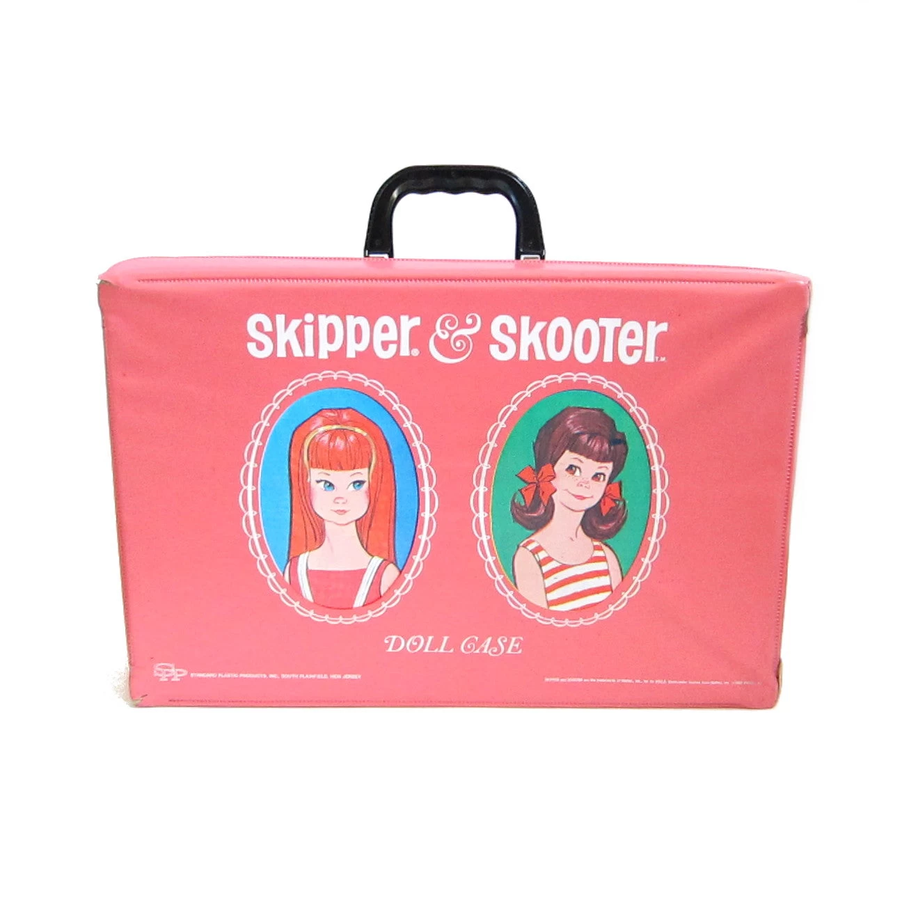 This vintage Barbie doll storage and carrying case says “Skipper & Skooter ” on the front. The case is made of pink vinyl and has a black handle on top for easy carrying. There’s lots of room inside to store your Barbie dolls and their clothes, shoes, and accessories. The case opens from the side and fastens shut with a metal clasp.