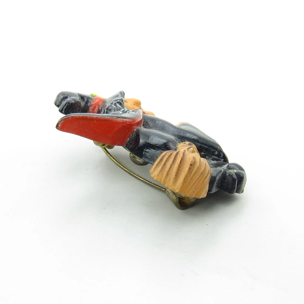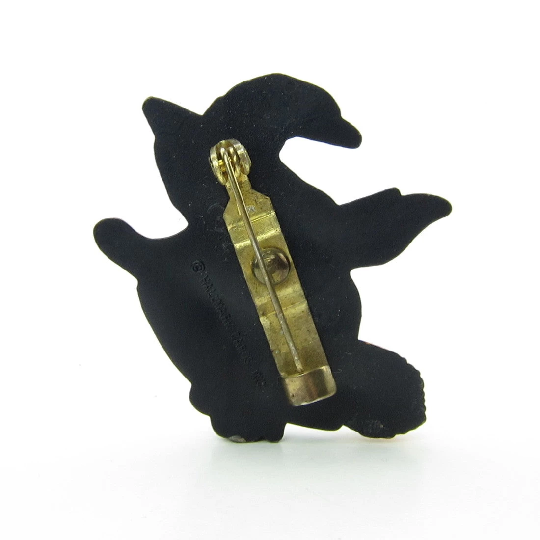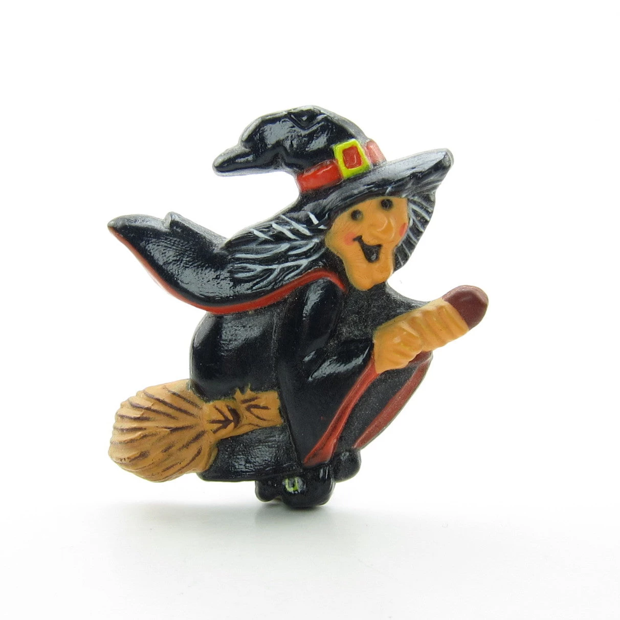 This vintage Hallmark pin features a witch dressed in black riding a broomstick with her cape flying behind her. The witch’s hat has an orange band and her dress and cape are also trimmed in orange.